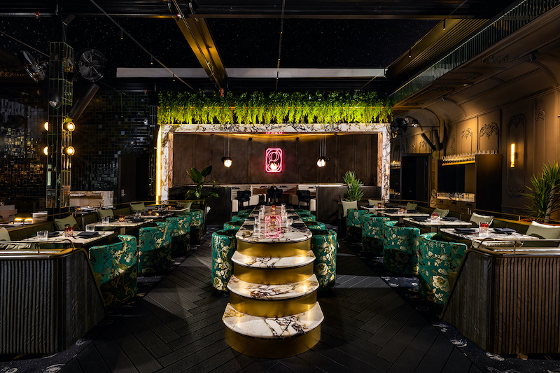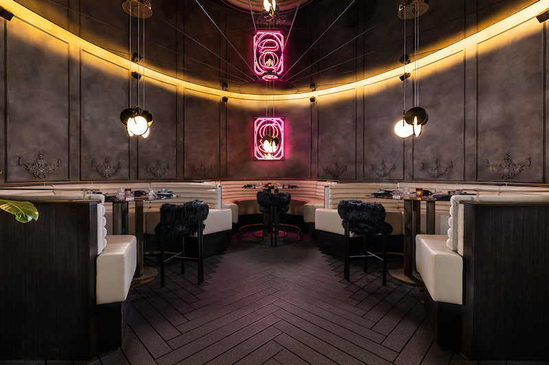 Miami is known for exaggeration. Giselle gracefully implements this according to the design of award-winning interior designer Tristan Du Plessis from South Africa. A tunnel of mosaic tiles brings guests to Giselle’s impressive interior, which is highlighted by marble, velvet and wood embellishments. Quite the capricious lady, Giselle is sophisticatedly versatile, seductively captivating and extravagant with thoughtful design details from around the world: from massive alabaster lamps made in Paris and outdoor furniture made in Cape Town to the handmade bar lamps from New York.