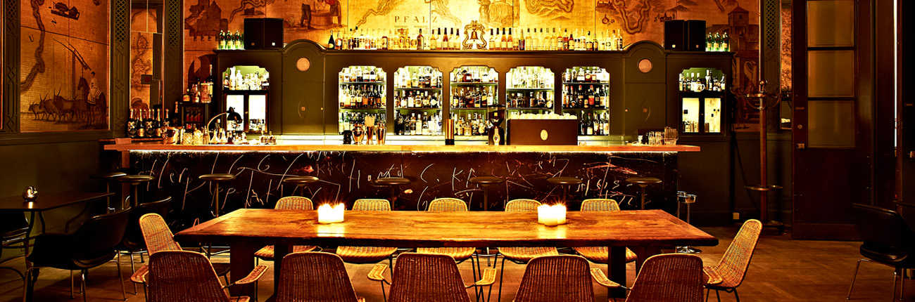 The meaning of the ‘St.’ in Klaus St. Rainer is almost irrelevant. Because no first name resonates like the nick name given to the owner of the Goldene Bar. ‘The Saint’ and his screw crew mix classic drinks with a modern twist. The owner’s tattooed arms make for an animated contrast to the leaf gold covered walls. The murals painted by Karl Heinz Dallinger, featuring maps of Cuba and Haiti as well as illustrations of tobacconists or a whisky distellery, tell stories about the origin of rum, cigars, tobacco, champagne, whisky and wine. The story of the bar is a moving one. It was part of the Haus der Deutschen Kunst opened in 1937, the first representative building of Nazi cultural politics. The building’s architect Paul Ludwig Troost developed the bar as a party location for artists. After the war, there were ambitions to remove the monumental touches of the building, the room size was reduced and the murals hidden behind panels. Later, the artistic director of the Haus der Kunst had the room sensibly revitalized. Today it is mainly furnished with pieces from the 50s and 60s.