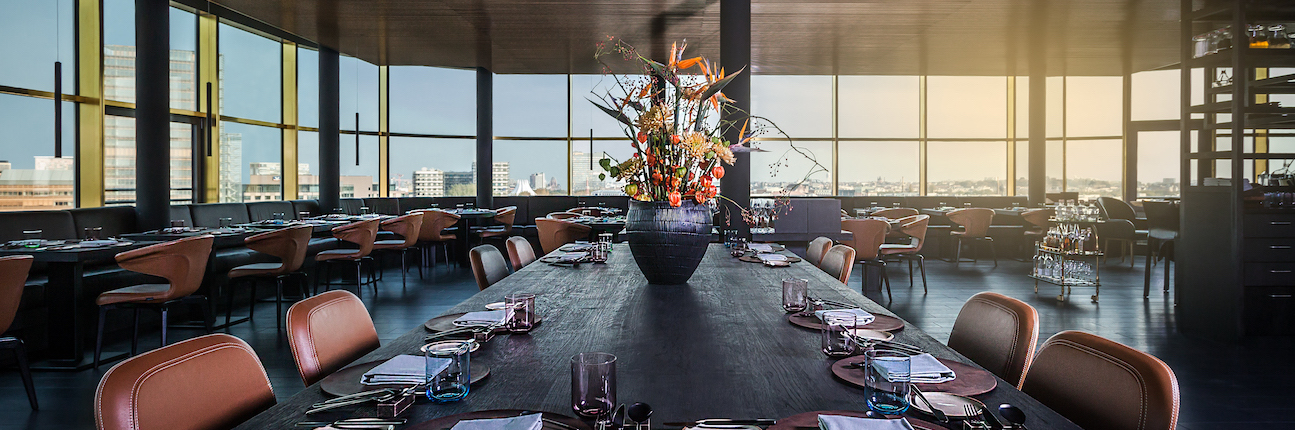 The interior focuses on the panoramic view. To let the colorful architecture of the neighborhood shine, the interior was kept dark. The effect is impressive. More Manhattan in Berlin is not possible!