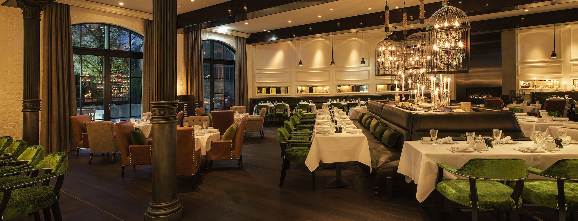 The atmosphere is emphasized by a smart lighting concept. Light spots, chandeliers and candles add a festive touch to the room. Bird cages hanging from the ceiling are a reference to the restaurant’s neighbor: the zoo Zoologischer Garten.
