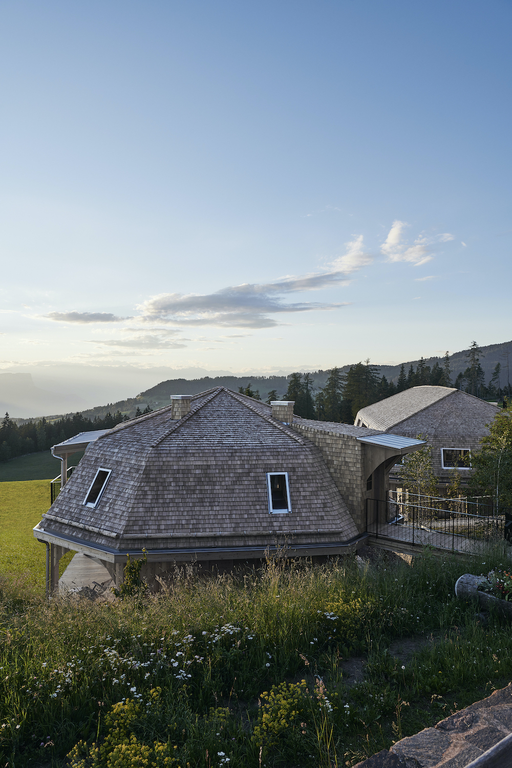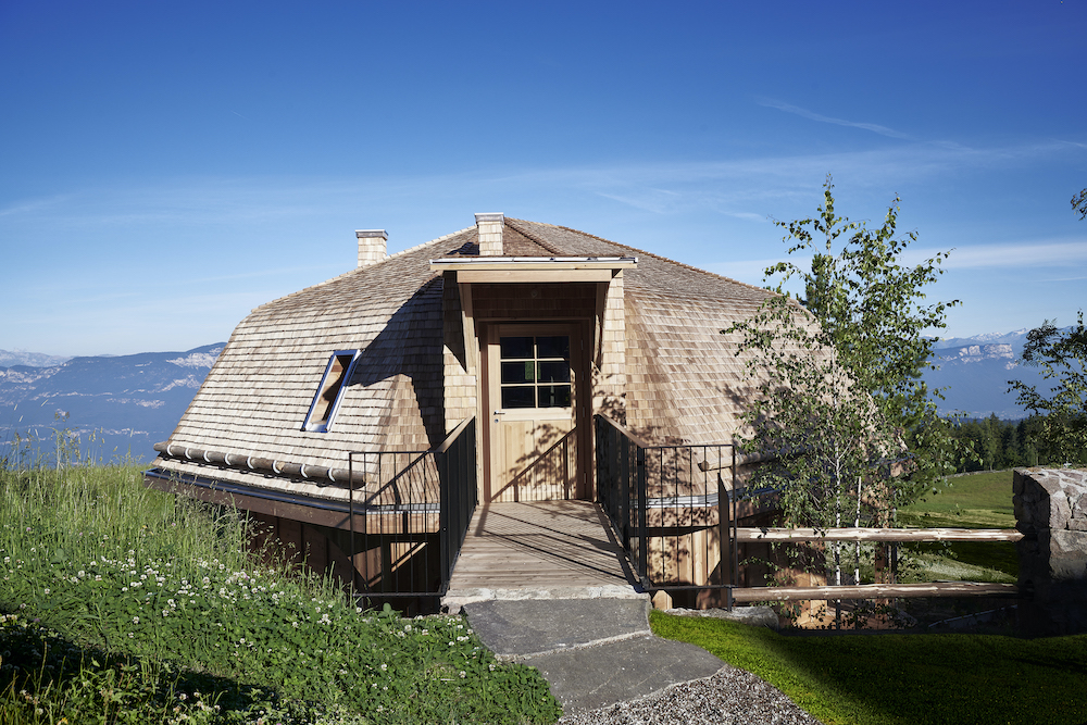 The Häuser der Wiese (translates to houses of the meadow) are a very special extension of the Zirmerhof located high above South Tyrol’s Etschtal. The owner Sepp Perwanger commissioned the renowned Italian architect and designer Michele De Lucchi – who has been staying at this historic mountain hotel for years.