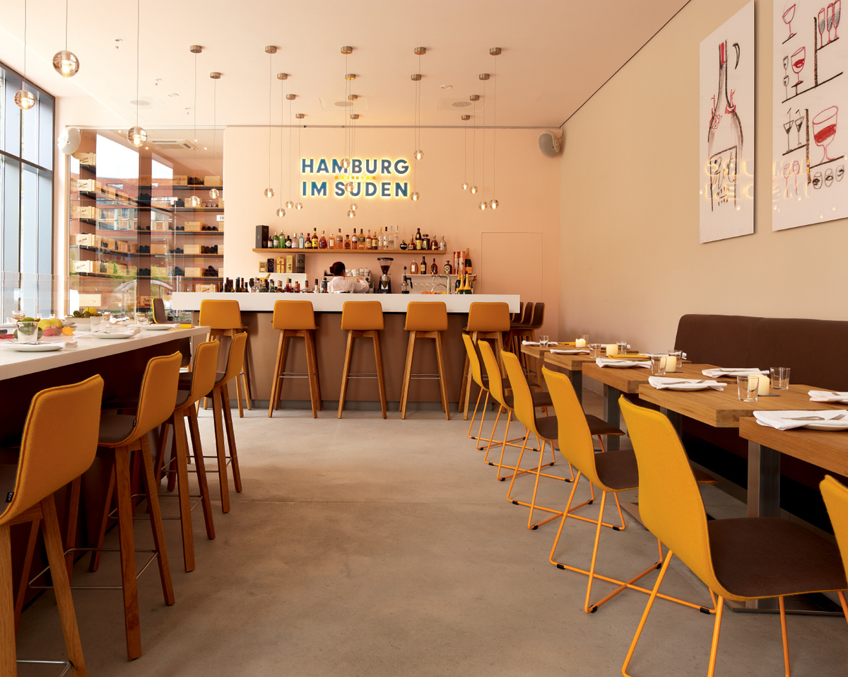 There is a lot to discover in the HafenCity in Hamburg. The wine and tapas bar ‘Hamburg im Süden’ is yet another reason to go there. The bar offers a nice view over the harbor and the historic Kaispeicher. The bar itself is contemporary and light. Guests can take a comfortable seat on KFF chairs. Besides the excellent wine selection and international tapas, Ceviche is the highlight on the menue. This finely sliced, raw, marinated fish is taking over Hamburg’s taste buds.