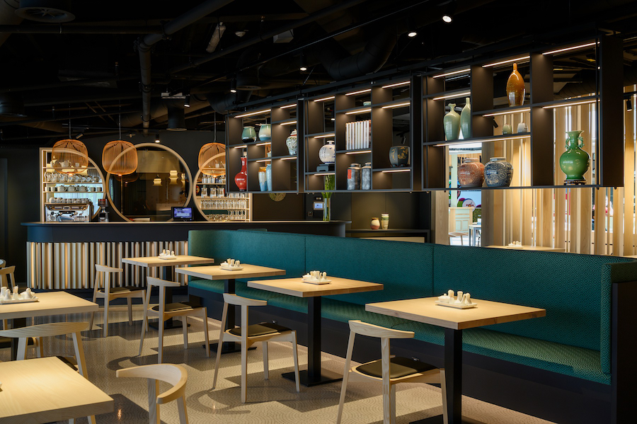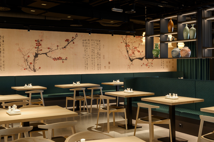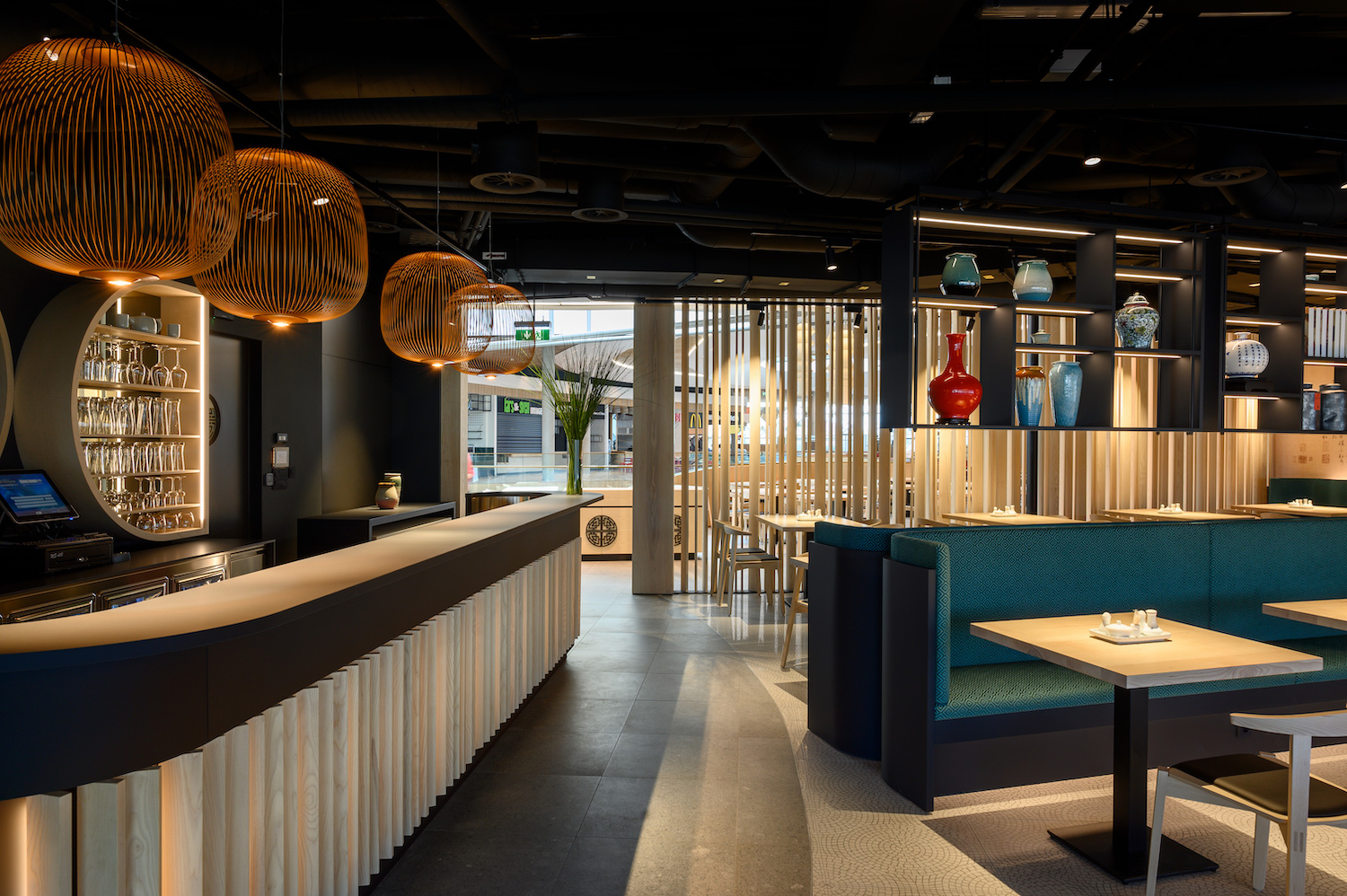 The third location of the Asian restaurant group opened in the new Alexa shopping center. The strategy of GAO architects was clear: Design of an interior that gently invites passers-by and then protects from the buzz of a commercial shopping mall.