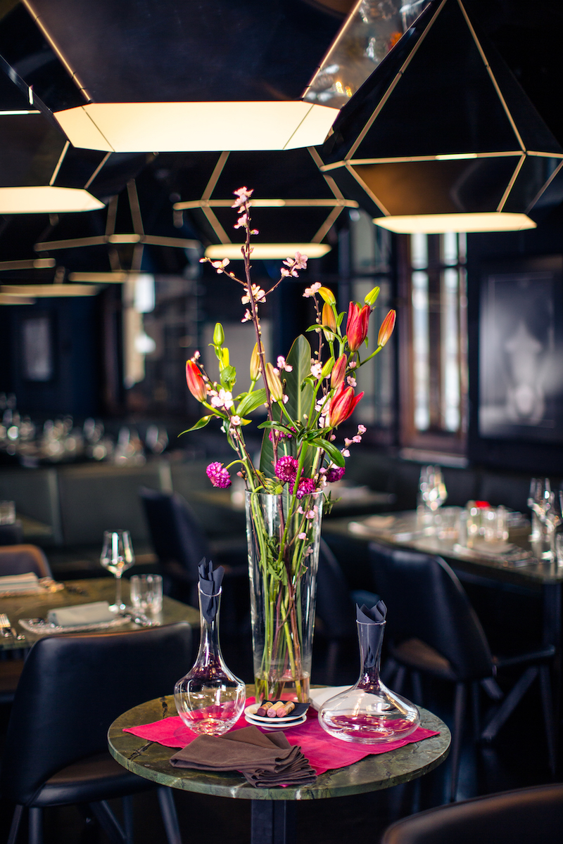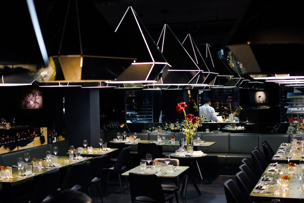 There is a show kitchen that gives guests a view of cooks at work and a bar that is the center of the room. It is lit up by lights that look like XXL diamonds and that give the green stone tables below them a special glow.