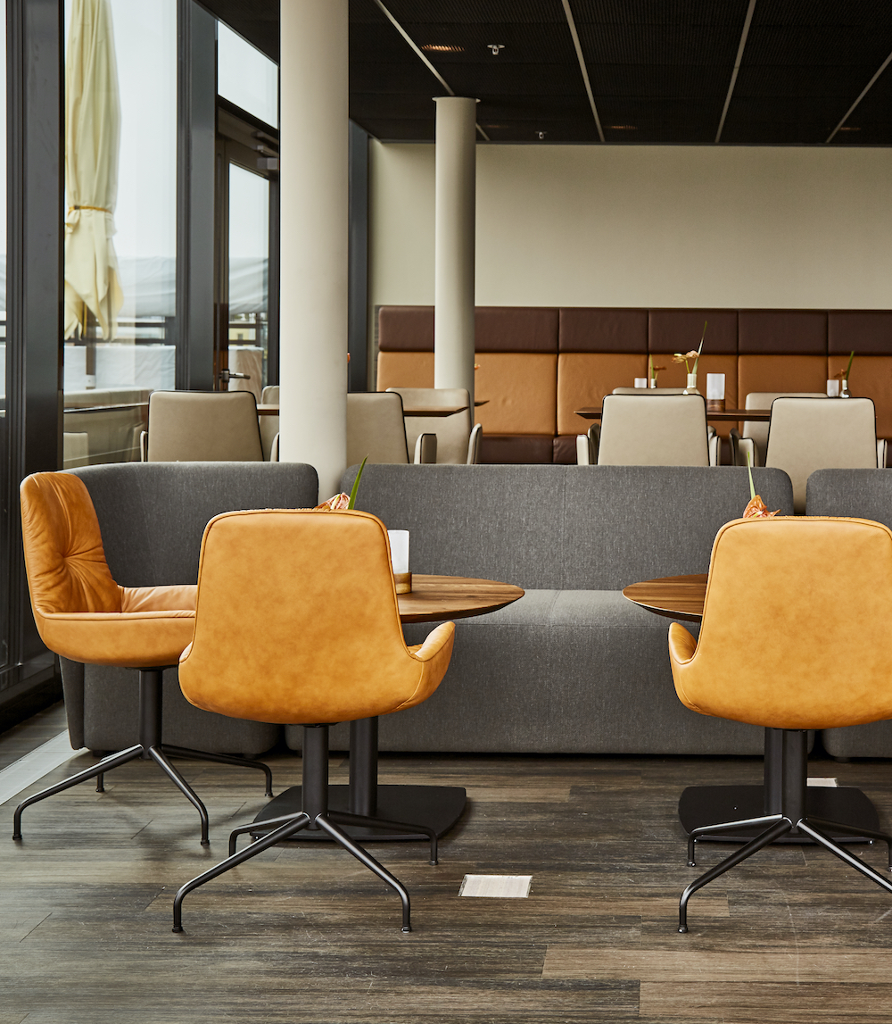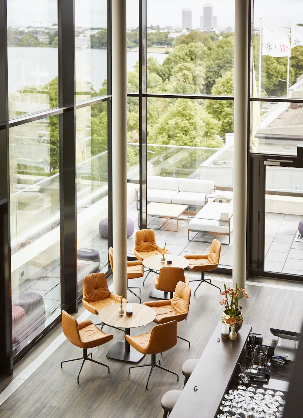 The bar is also special because of its culinary concept: Besides creative cocktails and unusual gin types, fine delights by Steffen Henssler are also served. Drinks and sushi are not only a fabulous combination when the sun is shining on the roof terrace. Thanks to the lounge atmosphere and lovely comfortable seats and bar stools by seating manufacturer Freifrau all can also be enjoyed inside.