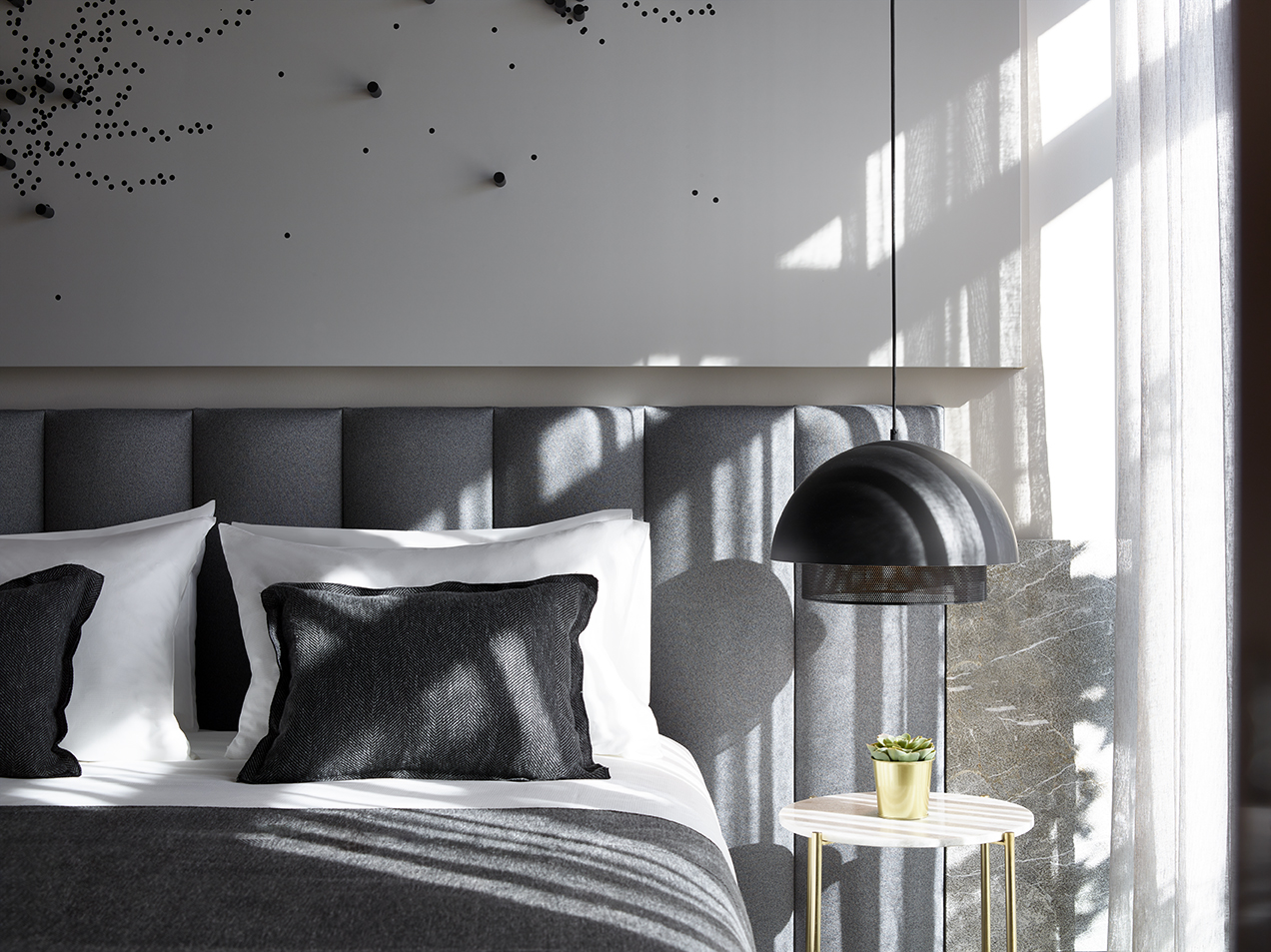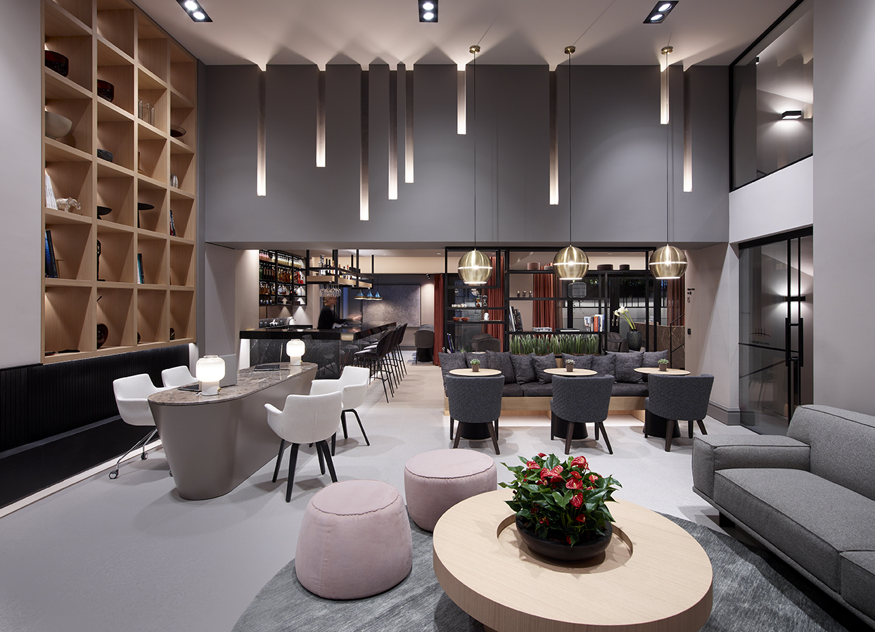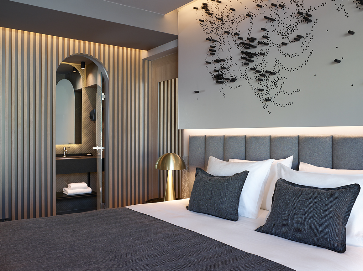 The breathtaking view of the suites enables a glimpse of the Parthenon. The materials include marble in black and shades of grey, oak wood, bronze, velvet on the seats. Elegant design in harmony with earthy colors create a warm atmosphere.