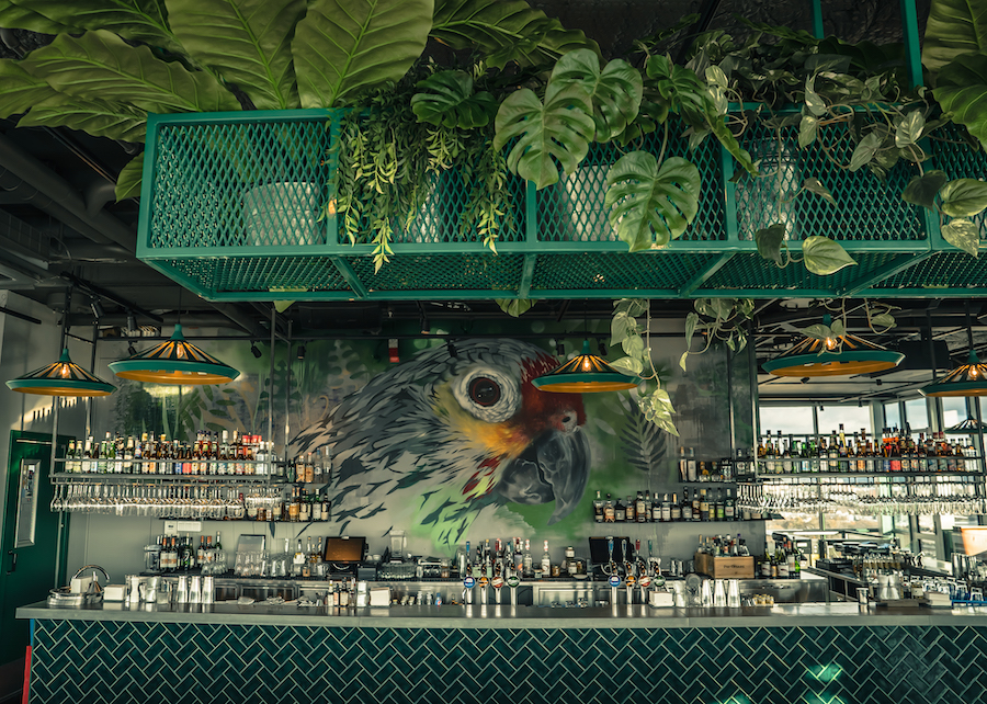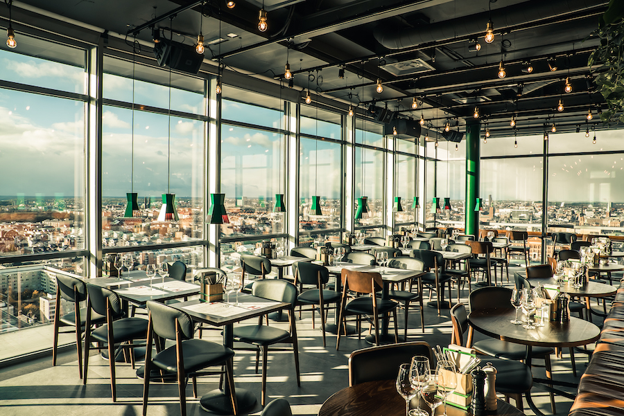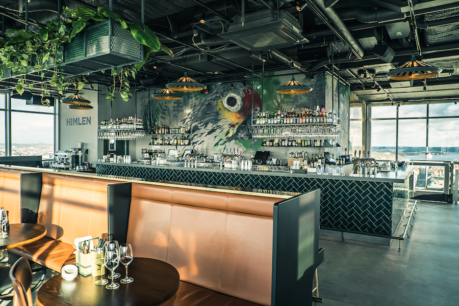 In the Skrapan high rise, in dizzying 100 meter height, one can find breathtaking views and a totally renewed interior. The latter was designed by Scheiwiller Svensson Arkitektkontor that offers guests of the Himlen enjoyment in a relaxed, urban atmosphere. The result is a successful mix of Berlin and New York style with a corresponding material mix of concrete and metal. A squad of street artists was commissioned with the wall design. The furniture completes the industrial look – dark chairs with a bistro touch, brass lamps and lots of plants make the Himlen a cozy hotspot.