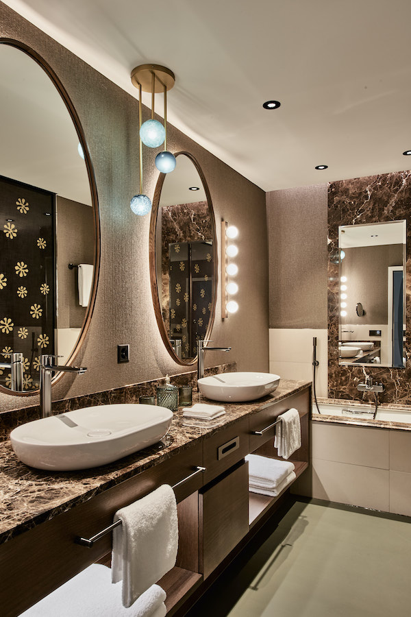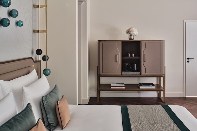 The aquamarine tones derived from it are reflected in the carpets, lamps and decorative elements, while warm brown tones and gray stone represent the landscape around the Tamina Gorge.