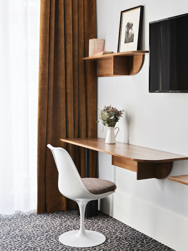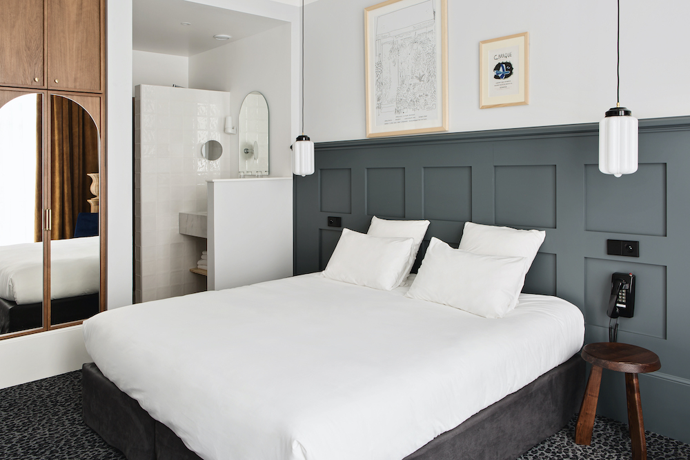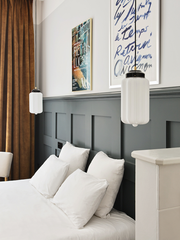 Stories about traveling start in the hotel, Isabelle and Gilles Moynier know. That’s why they’ve made theirs a place full of stories. A lobby where you can stretch out on sofas under a Neapolitan chandelier, surrounded by bookshelves full of souvenirs; an 18th-century Provençal writing desk; aristocratic family portraits; in the 30 rooms, posters, exhibition posters and handicrafts from all over the world; camel-colored velvet curtains; bathrooms inspired by 1920s lavatory cabinets – a charming retro atmosphere that stimulates your imagination.
