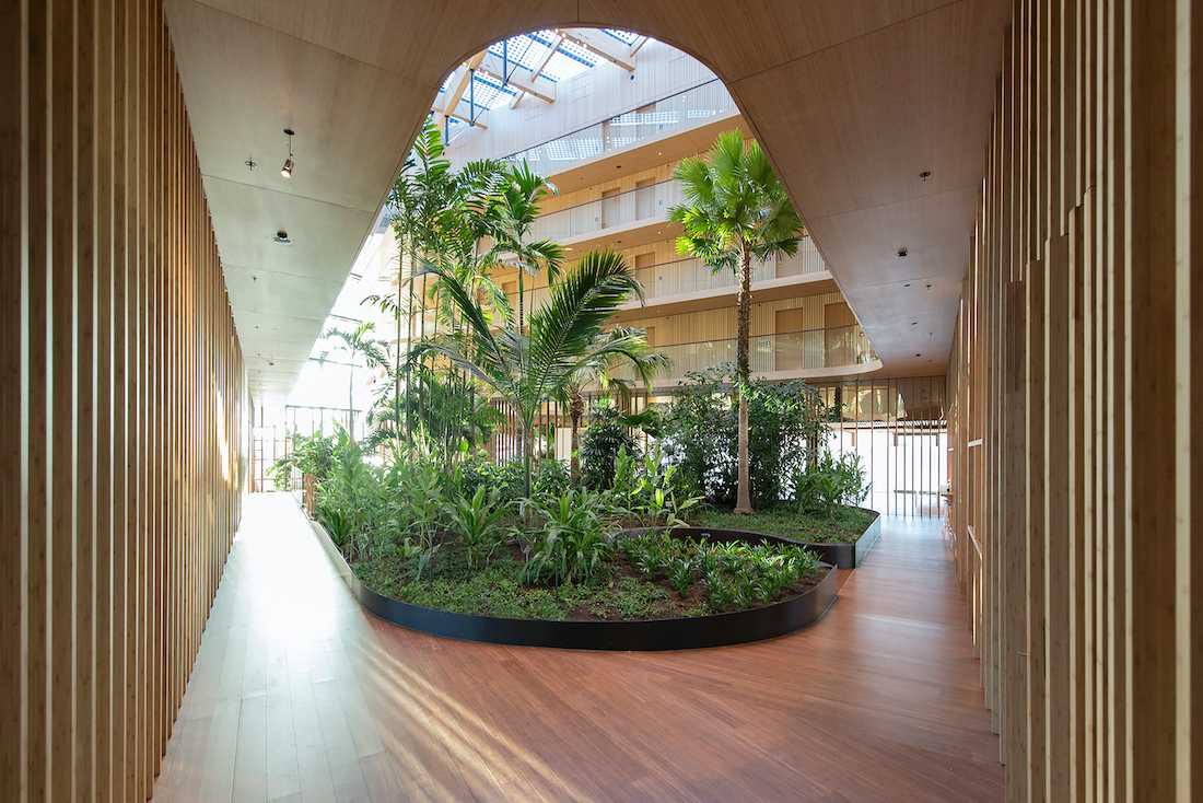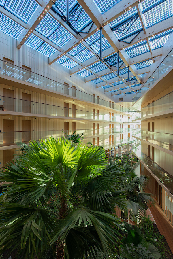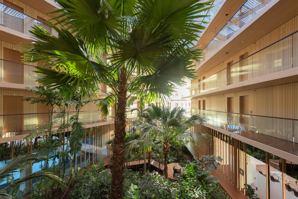 On the tip of the island Java, with a panoramic view over the IJ, the Hotel Jakarta, designed by architectural studio SeARCH, is located, a symbol for Amsterdam’s historic sea connection to Asia and on exactly the quay on which Indonesian immigrants set foot on Dutch ground after their long travels until the middle of the 20th Century. The more than 200 rooms welcome guests with a design mix of wood and far-eastern details. The balconies can be fully closed with glass to conserve warmth and keep noise out. Relaxing quiet is also radiated by the atrium. In collaboration with the Hortus Botanicus Amsterdam, a lush sub-tropical garden was created and invites to take a deep breath.