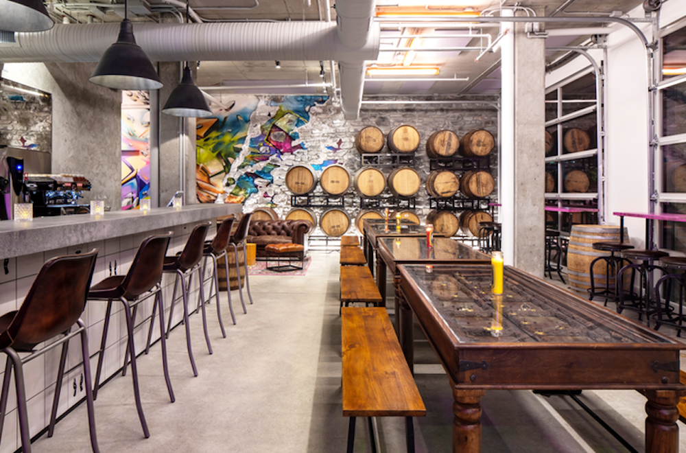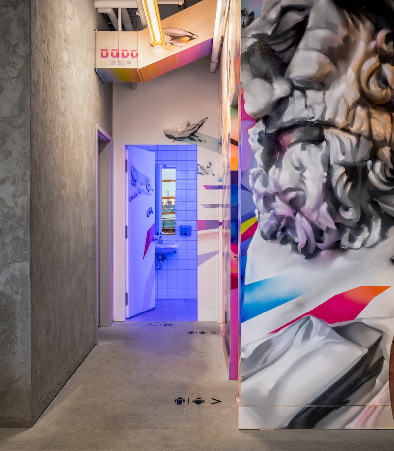 The back wall of the popular event location was sprayed by graphic designer and artist Dodo Ose, while the carefully selected furniture and decor is all about a cool yet comfortable and inviting style.