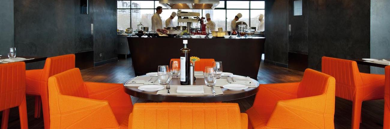 In the hotel’s restaurant Cucina, you can enjoy Mediterranean cuisine with Russian accents in bright chairs by Ligne Roset.