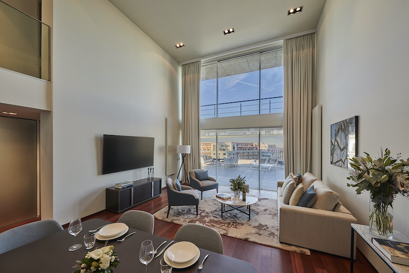 Of the 22 apartments, one stands out in particular: the 200 square meter, two-storey apartment with several bedrooms and two kitchens as well as a 100 square meter private terrace with a view of the Paseo de la Castellana.