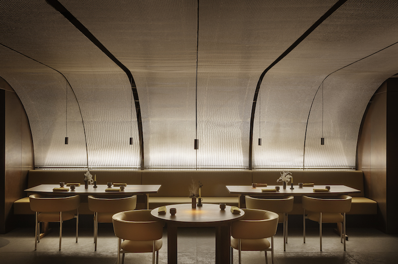 With an open kitchen, a spacious dining room, an outdoor terrace and a private dining area, the material palette of copper, stone, steel mesh, leather and oak creates a space full of drama and calm, forming a cohesive unit of all four rooms. Thulstrup completely renovated the interior, adding panels of a specially designed metal mesh that curves upwards from the restaurant’s windows and wraps the ceiling. The ceiling design is influenced by the spice-making process.