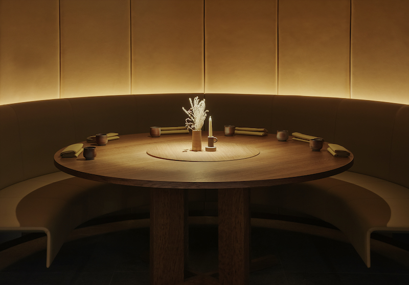 The restaurant’s walls are clad in oxidized copper sheeting finished with beeswax, while the floors, covered in Gris Catalan limestone, have been flamed and brushed to give the look of a hammered surface. The bespoke furniture and built-in joinery were made from British oak. Benches, chairs and wall panels are lined with ginger colored leather.