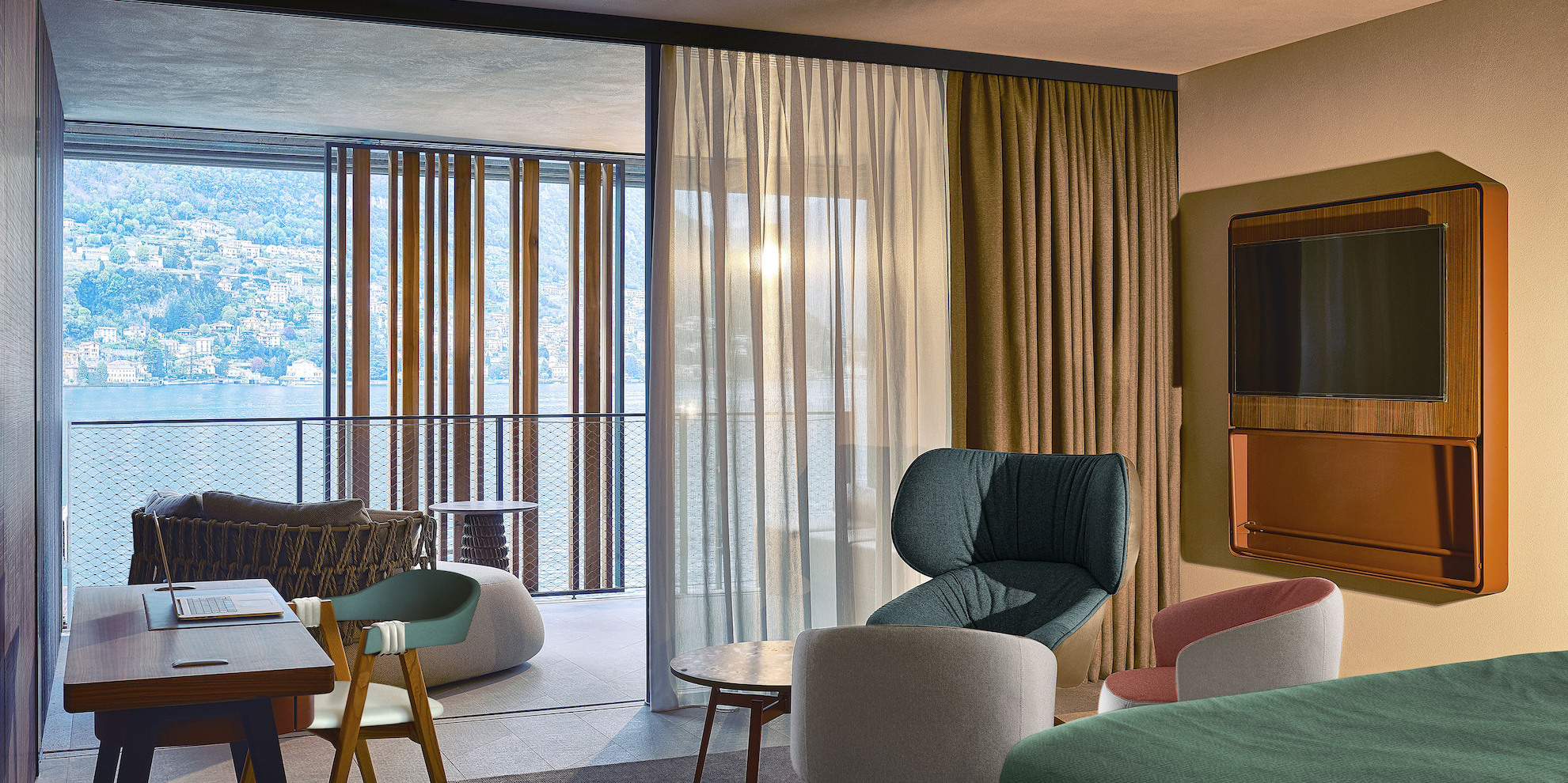 Il Sereno is only 50 minutes away from Milano’s city center or the Malpensa airport. Compared to the bustling life in the fashion capitol, life is very contemplative here.  Designer Patricia Urquiola – who was born in Spain but lives in Milano – was drawn to this project because of its unique location. While other hotels around Lake Como are furnished classically or even pompously, her contemporary, low key design sets a contrast.
