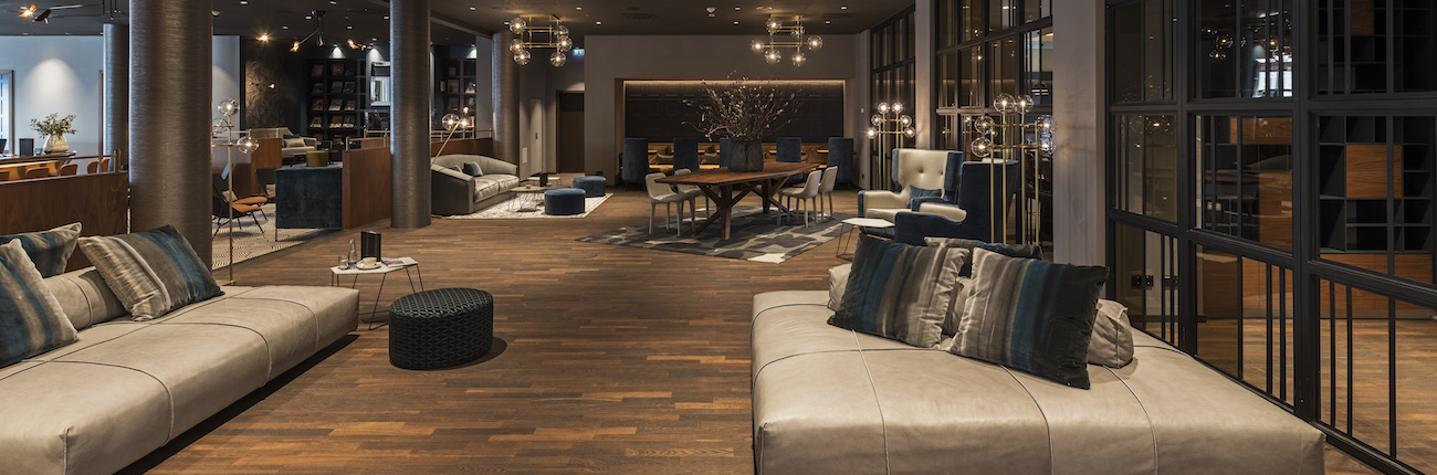 For Unterschleißheim’s Hotel INFINITY, he designed the heart of the hotel in close collaboration with owner Christina Striebel: the 600 square meter large bar on the ground floor. Intimate lounge zones radiate cozyness as well a cosmopolitan flair. Even though it is huge, the bar feels like a private salon. The composition of the maestro features dark walnut wood, graphic patterned rugs as well as sensorial fabrics in teal and cinnamon.