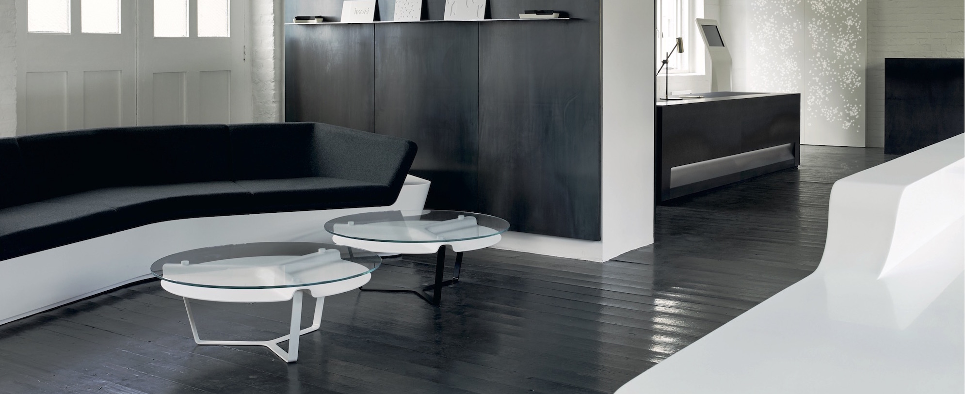 Isomi co-founder and chief designer Paul Crofts picked tup he industrial heritage of the building and combines it with the minimalist approach as well as the differentiating color palette of the label that is specialized on modular office furniture and reception counters.