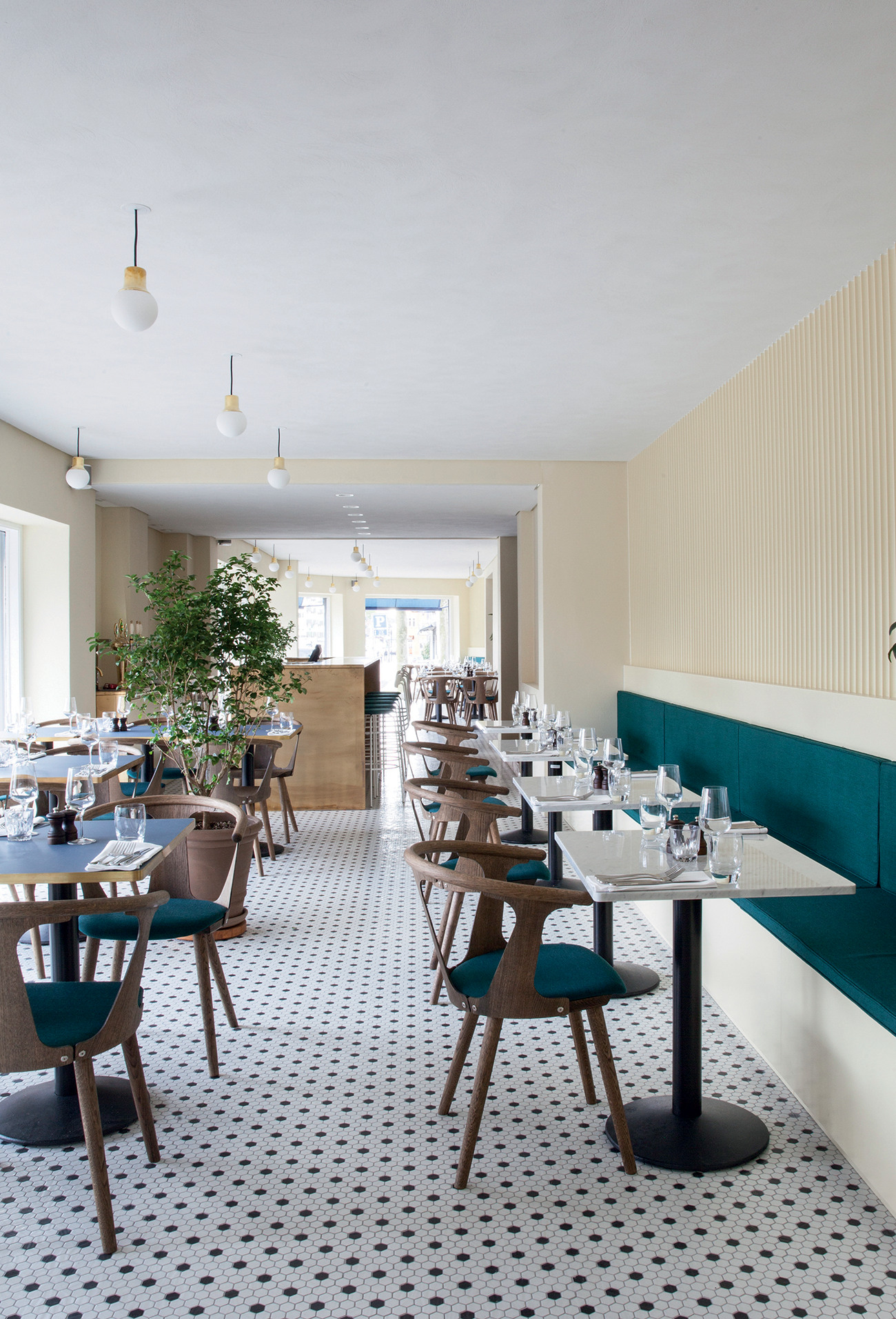 The Norm architects wanted to give this Italian restaurant, which belongs to the Cofoco group, a Mediterranean look. Light yellow walls, azur blue upholstery and many plants remind visitors of trips to sunny southern Europe. But they also wanted to assure the restaurant design fits the Scandic surroundings. Hence they added furniture by Scandinavian design brands and wooden floors from Danish company Dinesen.