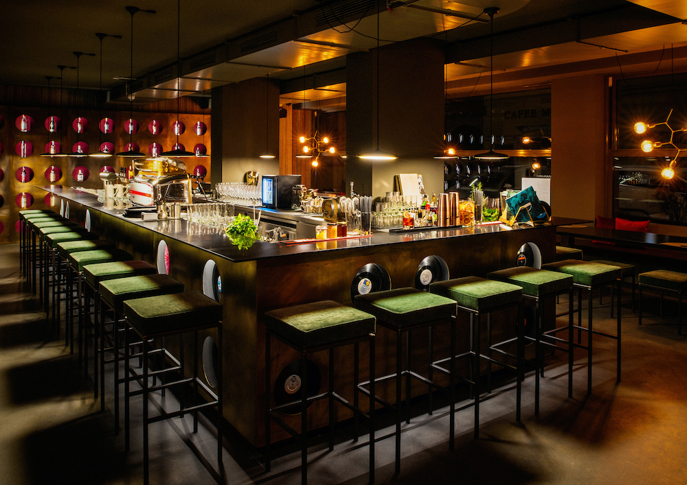 Room-high windows offer an unusual view of the city surrounding, velvet sofas complement the flair. Similarly well tuned: the classic 33 rotations of vinyl, dark sofas as well as impressive textile wallpapers in the restaurant and the brass bar.