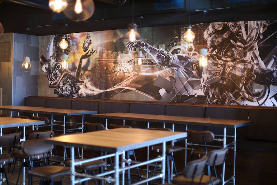 One should not miss another highlight of the interior: the airbrush wall design that gives the room a futuristic touch.