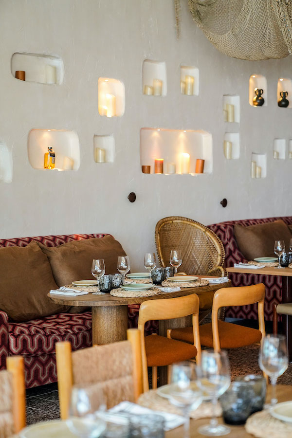 The charm of rural Greece, Ibiza’s freshness and the warmth of Tulum – very different sources of inspiration characterize the restaurant located directly by the sea. The individual mix of Studio Dalla Polvere focuses on handicrafts and cozy furniture from the 60s. Simple materials characterize the interiors: wood, cotton, wool or natural fibers. Unusual are the floors covered with porcelain, which, together with the whitewashed walls, remind of Mediterranean villages.