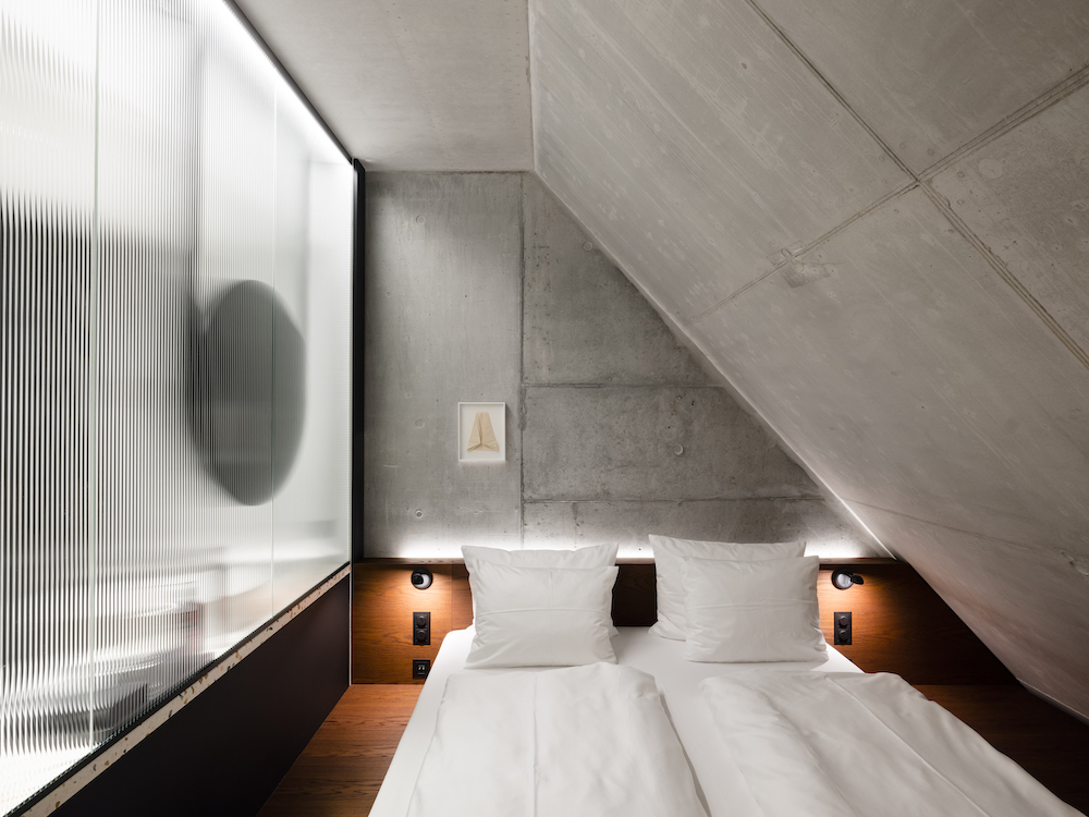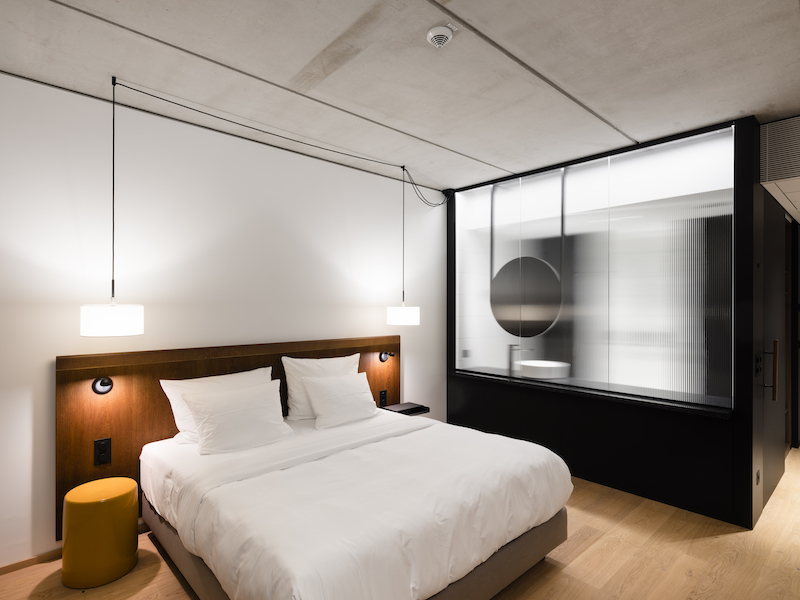 Openness and transparency also dominate the interior design concept of Berlin’s architecture studio Mekado. The complex building geometry creates a variety of different areas and hotel rooms. The design theme is a spacious continuum with clear shapes, natural materials and many view angles. This can be found in the triptych ground floor with lobby, restaurant and café but also in the shape of the semi-transparent glass walls as connecting elements between sleeping area and baths in the rooms.