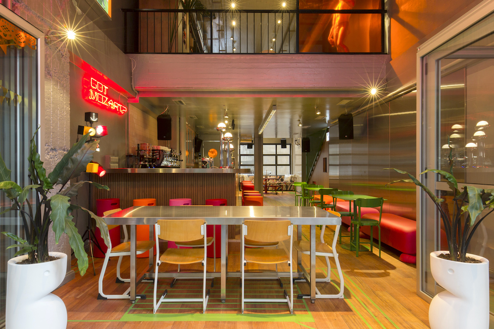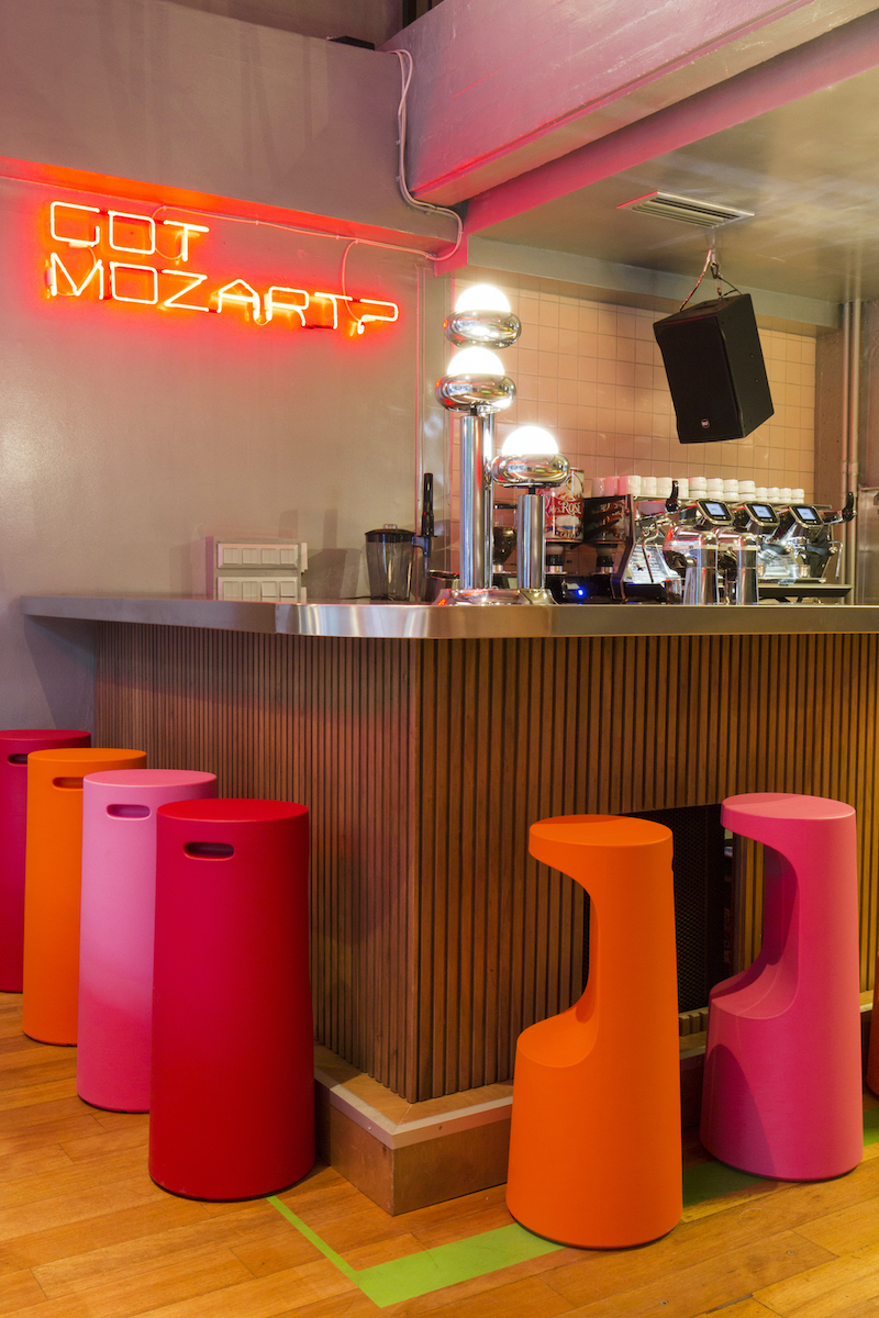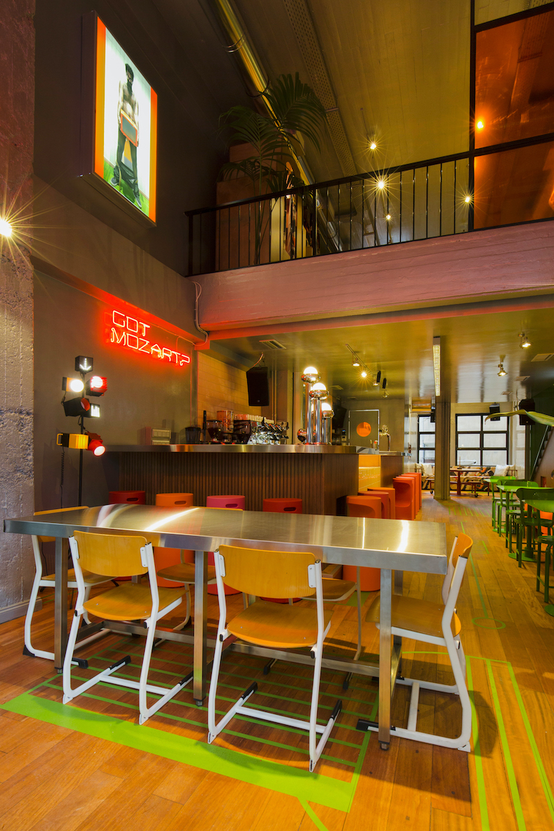 Synthetic chairs and wooden tables, neon illuminated ads and metallic surfaces make for an exciting and open atmosphere radiating “Everybody is welcome here!” The collection of individual furniture and unusual rooms include rotatable, a confessional box and a sweet bar serving Athenian sweets – with the warning “Bad for your teeth”.