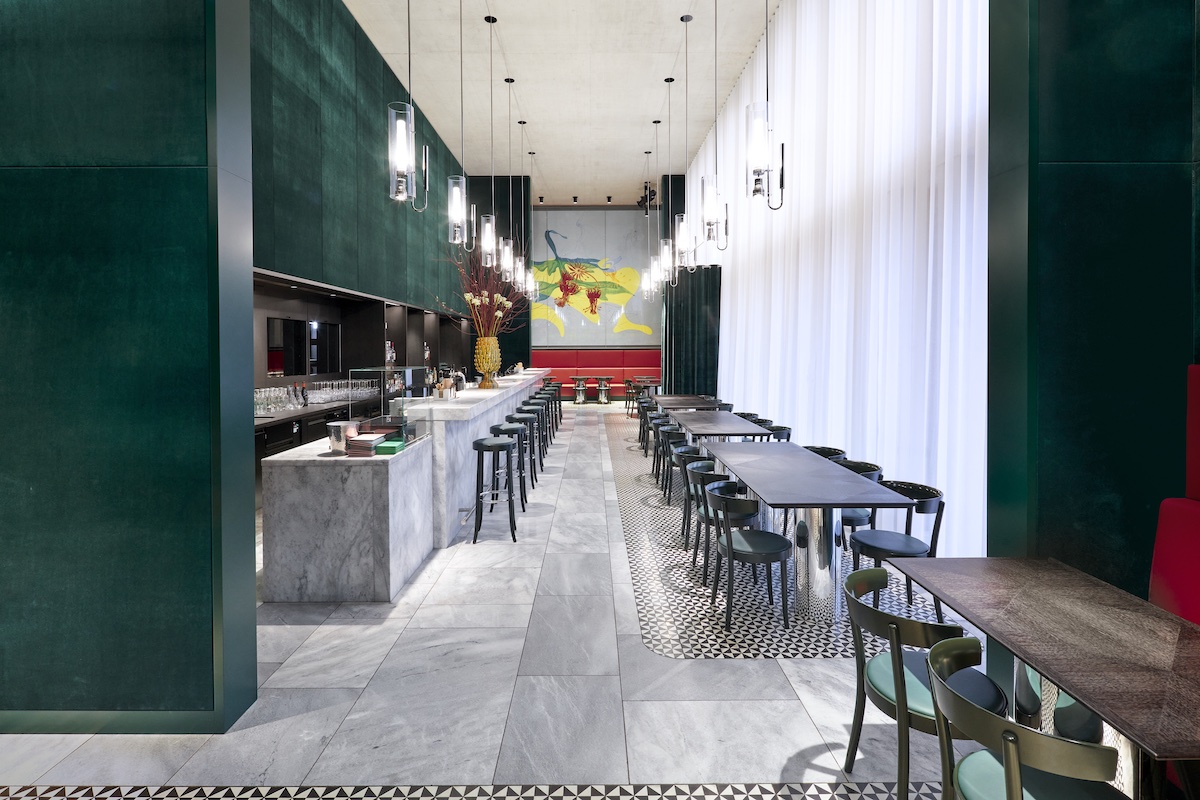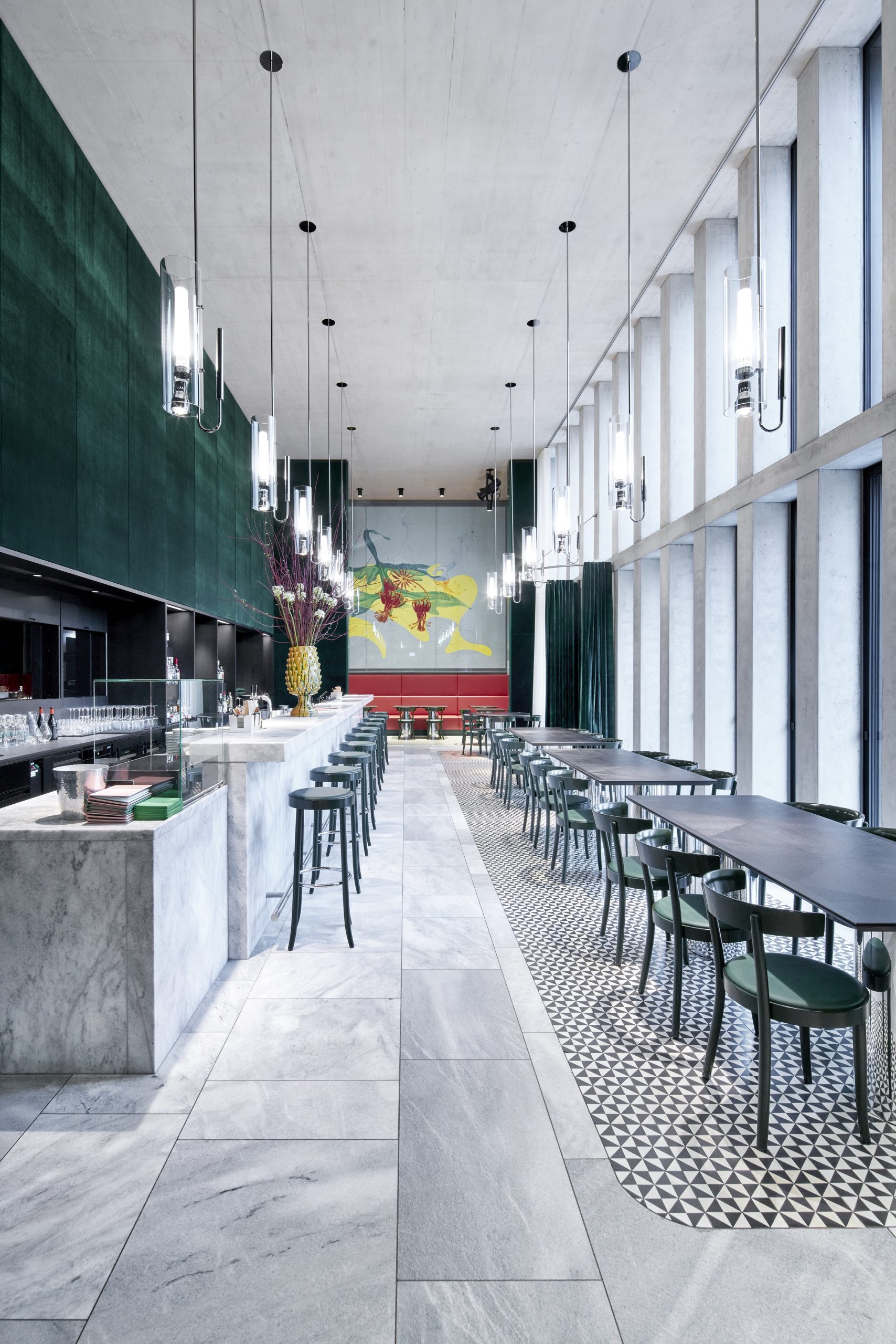 While his ashlar of Liesberg limestone looks very purist on the outside, Chipperfield has created a surprisingly warm atmosphere in the bar. The almost twelve-meter-long counter is made of Krastal marble, and the wall behind it, as well as the bar stools, are covered with dark green velvet, which shimmers magically in the daylight that falls through the high windows.