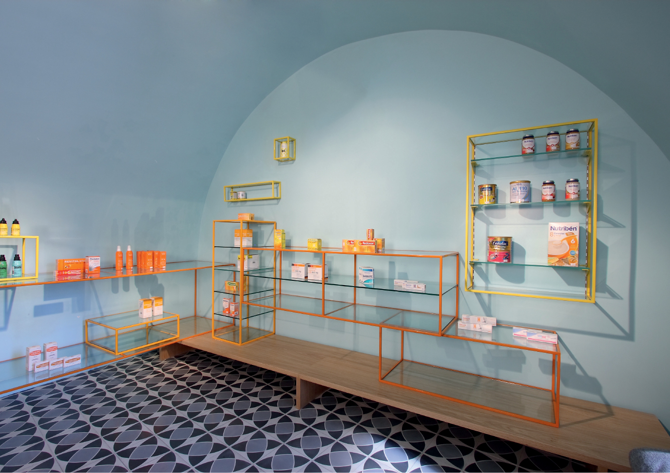 Maybe you forgot your toothbrush? In any case, it is easy to find an excuse to check out this pharmacy. And the district where it is located is a must for any visitor. It is the old domain of the Habsburgs, El Madrid de los Austrias. The store: products are presented in front of a blue wall and are lined up on a thin metal structure. Everything radiates an airy lightness. Stone Designs about their achievement of balance: “We wanted to create a space that contrasts the professionality of the pharmacist with human warmth.”