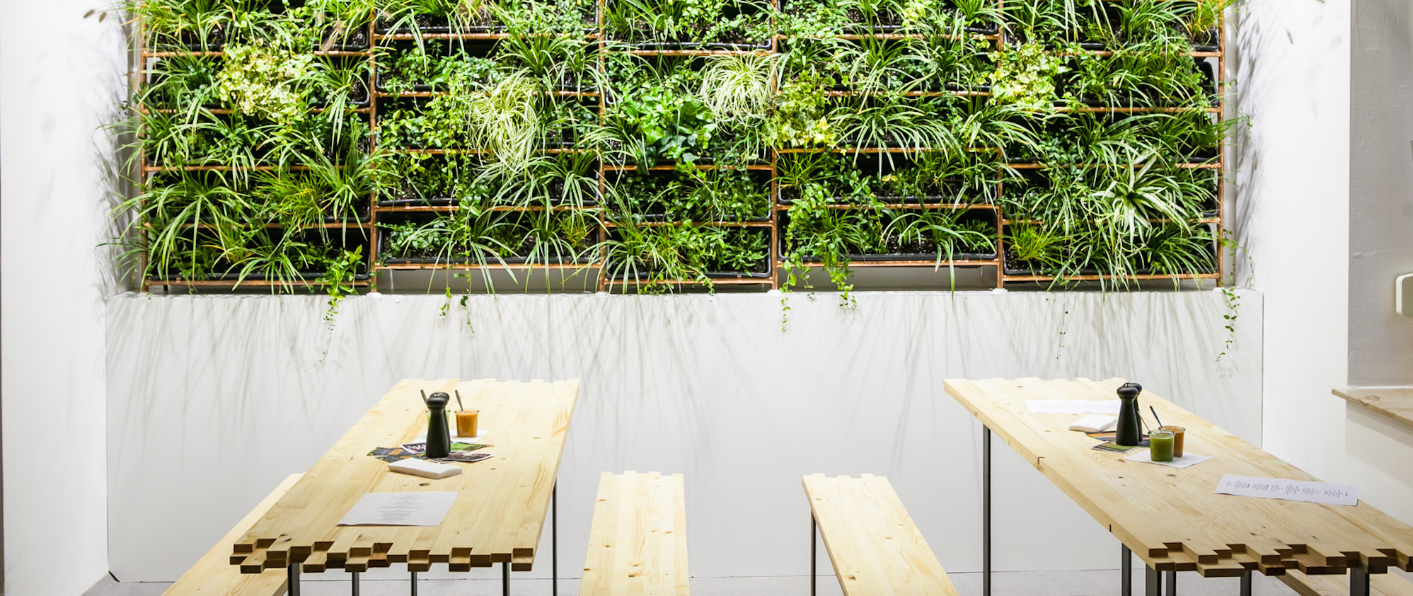 The interior decor was developed by the team. Tables, lamps, white boards, vertical garden are all zustoße designed and made.