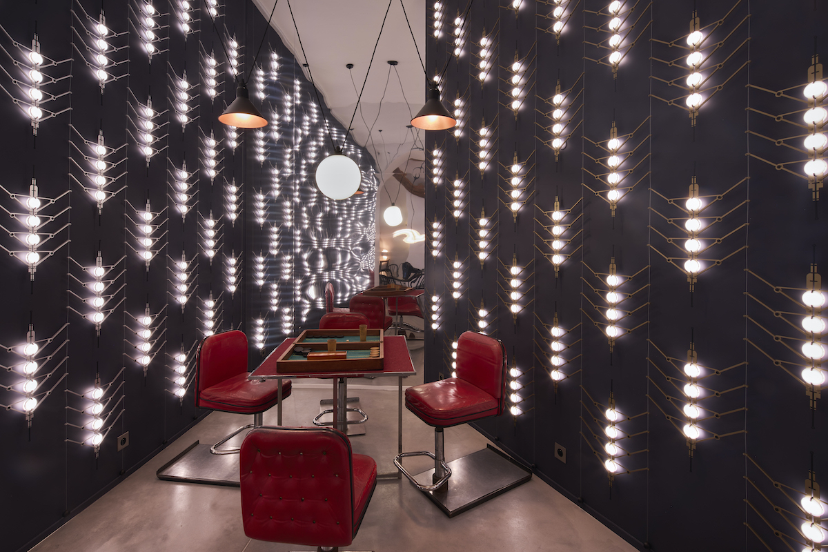 Equipped with a real fireplace, a kitchen, a Chinese living room, a bathroom and backgammon games, Le bar Électrique is an ideal place to meet, be inspired by the objects and check around the clock whether the presented switches and lights are the right companions for your everyday life.