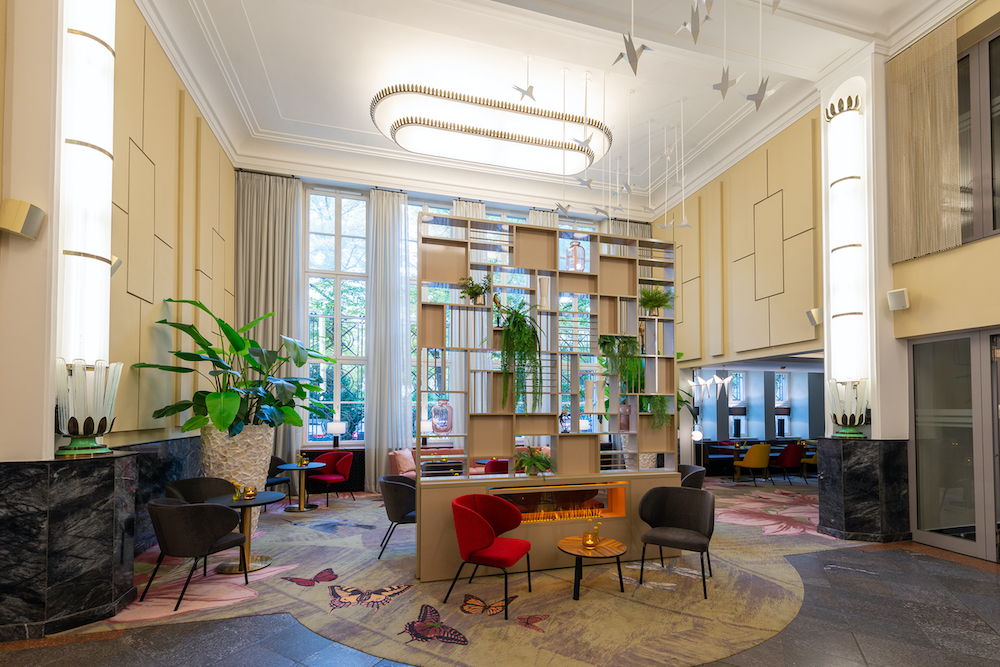 Adding to the lightness is an impressive flock of paper cranes that floats in the 6.50-meter-high Open Lobby and draws the eye to the adjacent bar.