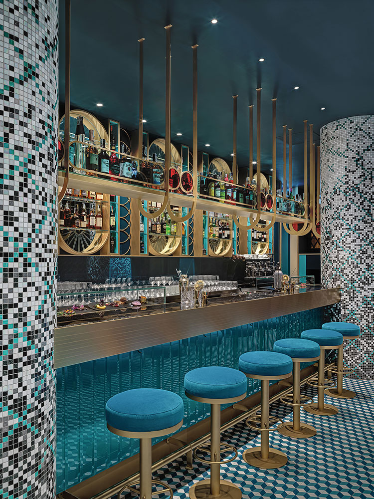 The restaurant is located in the heart of the city, half way between the Piazza Navona and the Pantheon. Roman architect Daniela Colli was responsible for its design. She set colors such as turquise, teal and a deep red as a contrast to the stern facade of the 30s rationalistic building. Dimmed and playful lights let the Dolce Vita of the past arise. Mosaic tiles decorate the columns and the floor is covered with a dizzying pattern of two-toned stone. Just as the lettering with clear Art-déco references, it reminds of Baz Luhrmann’s film of Fitzgerald’s legendary novel “The Great Gatsby”.