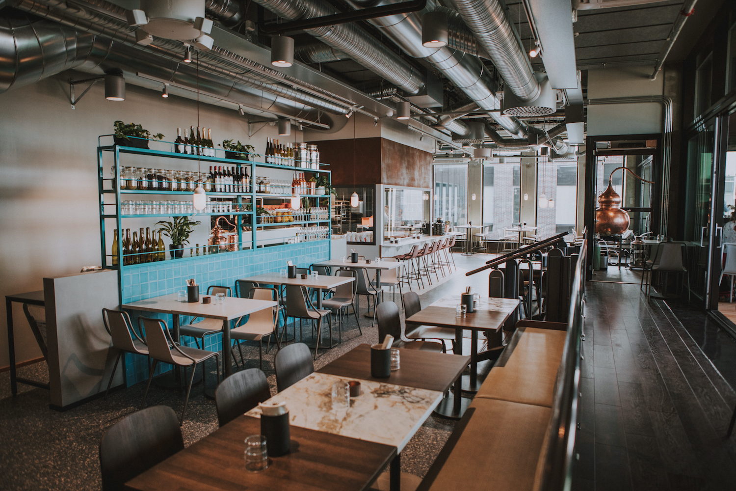The Loi Loi has its own nano distillery, in which Edward Szechi makes his gin variations every evening. The heaters integrated in the wooden panels of the ceiling assure that guests can slurp their gin in the winter while enjoying beautiful views of the Konepaja district.
