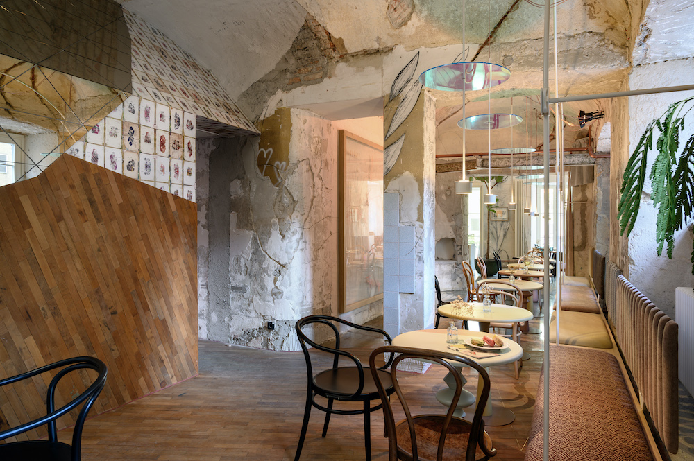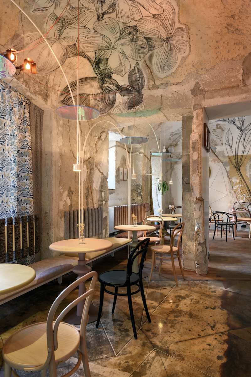 Floors and walls are decorated with Jaša Mrevlje Pollak’s art intervention “Lover’s Deal”. It is this mix of creativity and conviviality, of a touch of concept art and successful interior design, that give this place a special atmosphere.