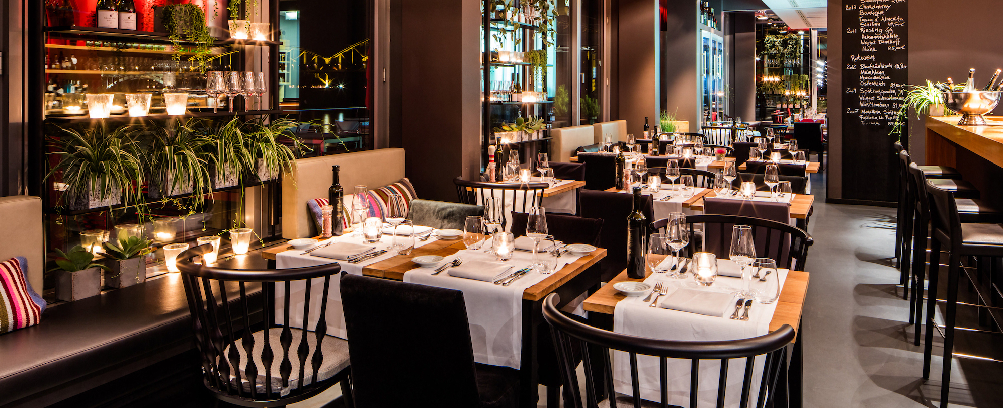 Its interior was inspired by the location directly at the Rhine river. Harbor cranes outside correspond with industrial retro elements in the restaurant.