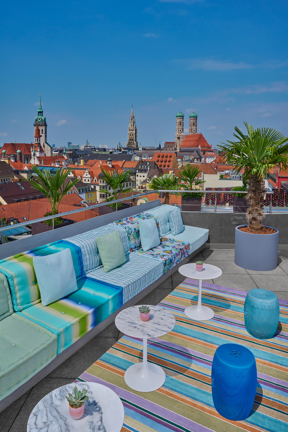The Roof Garden got its name from a true design icon: Mah Jong, the sofa designed in 1971 by Hans Hopfer for the French premium brand Roche Bobois, that adorns the roof terrace in a new outdoor version and that invites to joyful lounging with its refreshing colors.
