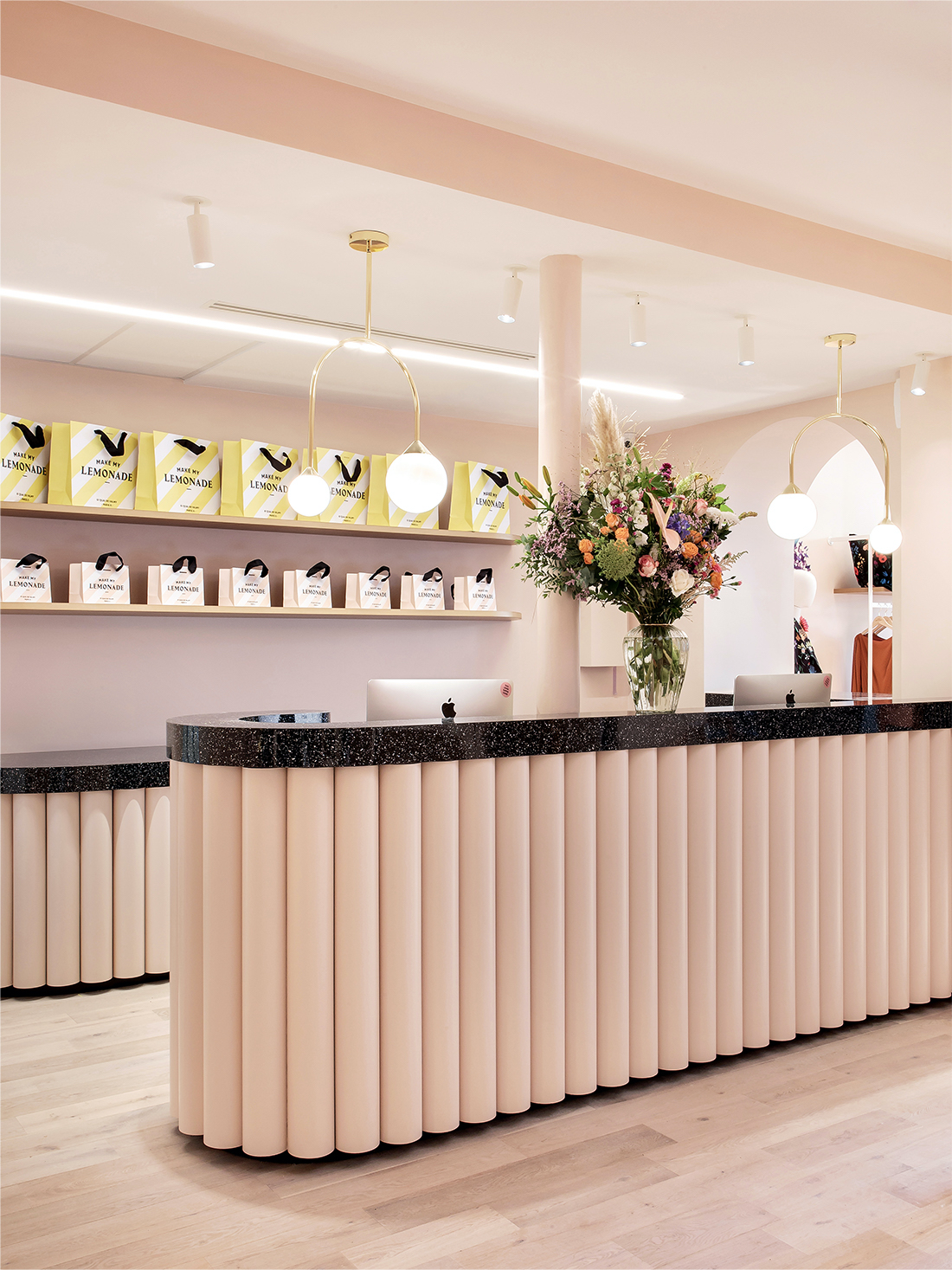 The stylish Lemonade Café with strong Art-déco references is located at the end of the boutique