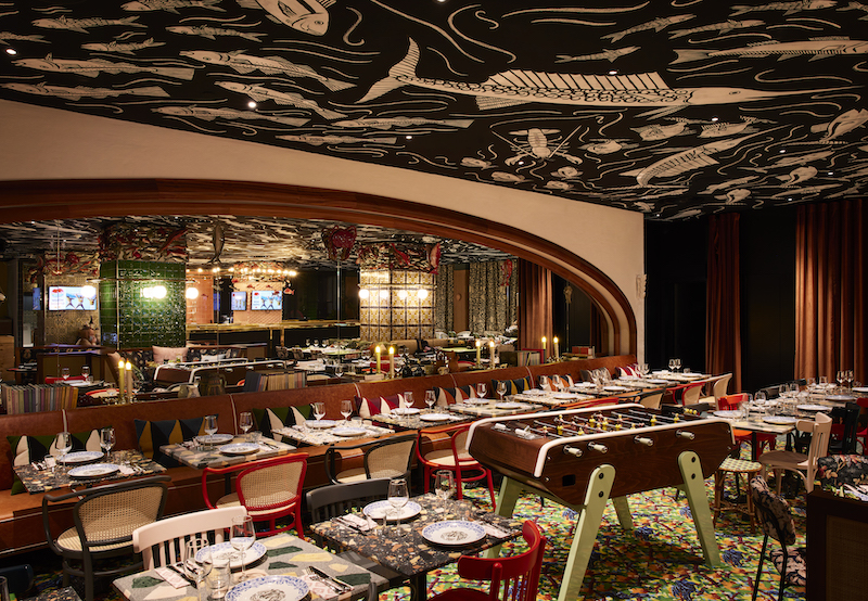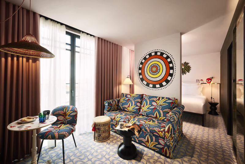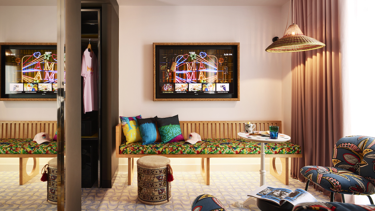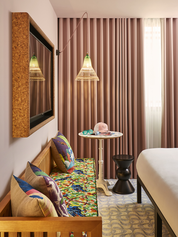 Friendly, cheeky, colorful: these adjectives describe the image of the Mama hotel brand, for whose design the in-house Mama Design Studio, but also big names like Philippe Starck, are responsible. Opened in January 2022, Mama Shelter Lisboa, the chain’s first hotel on the Iberian Peninsula, has drawn diverse inspiration from Portugal: There are Viúva Lamego tiles, blue wave carpets and smart TVs embedded in cork (cork is one of the country’s treasures), light shades made of Portuguese straw, and artwork by Bordallo Pinheiro.