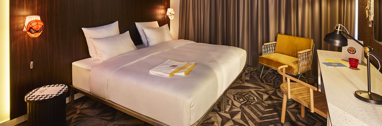 Several openings – some of them international – later, the hotel chain indulged itself with a branch in Prague for its tenth birthday. The typical Mama Shelter DNA is everpresent in the straightforward functional building: from the playful lobby with pool tables and pinball games to the fresh design in the mandatory masks of comic heroes in the rooms.