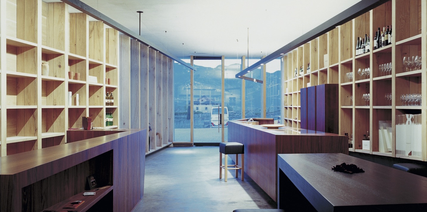 Architects Walter Angonese and Rainer Köberl chose concrete and local wood for the construction of the wine cellar and sales room placed in the mountain.