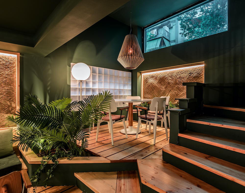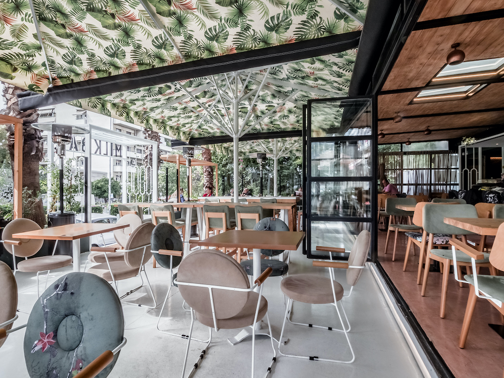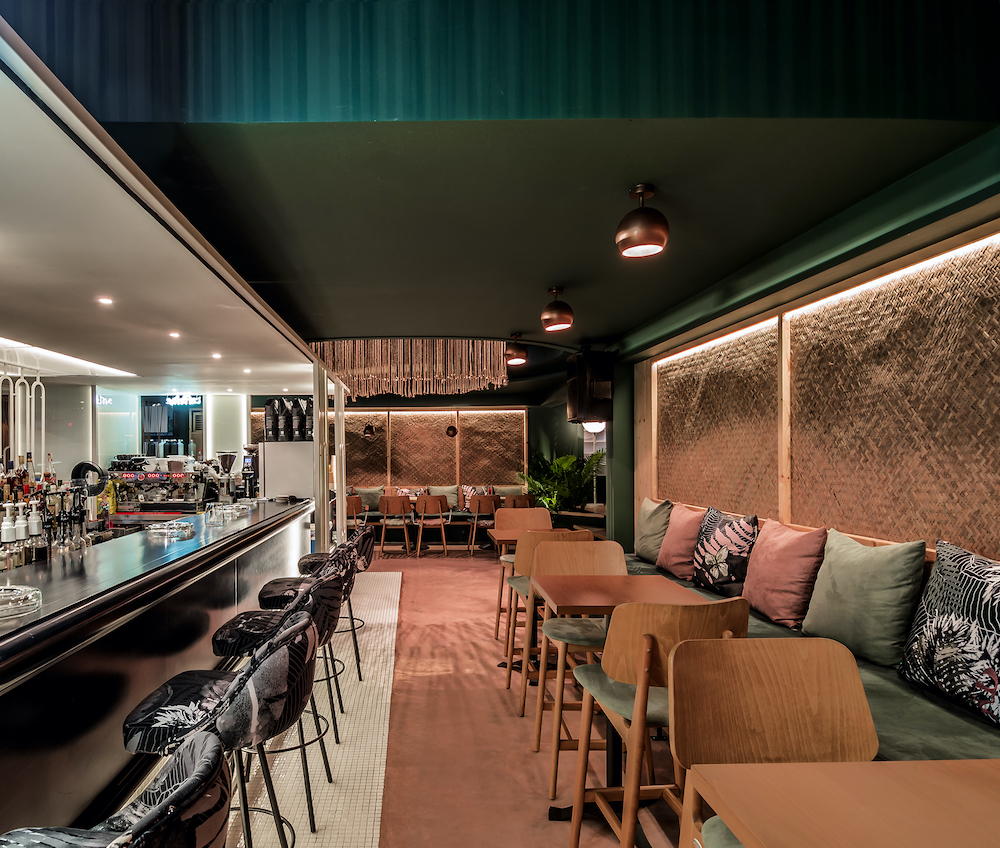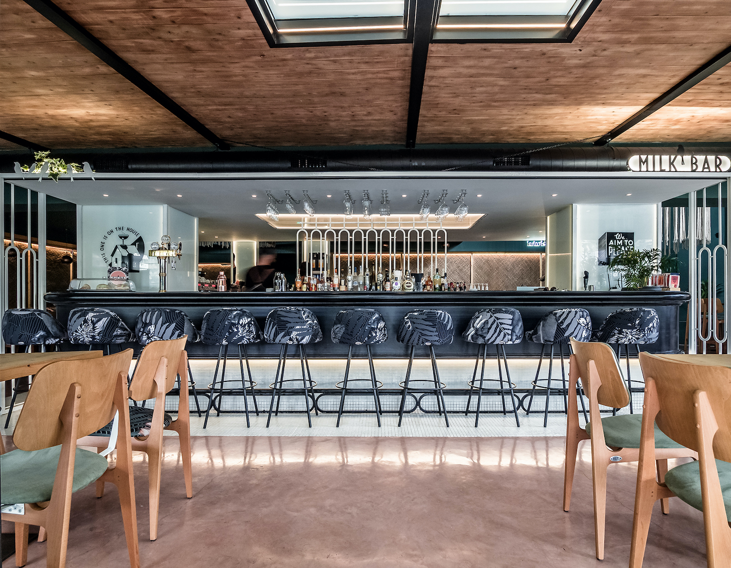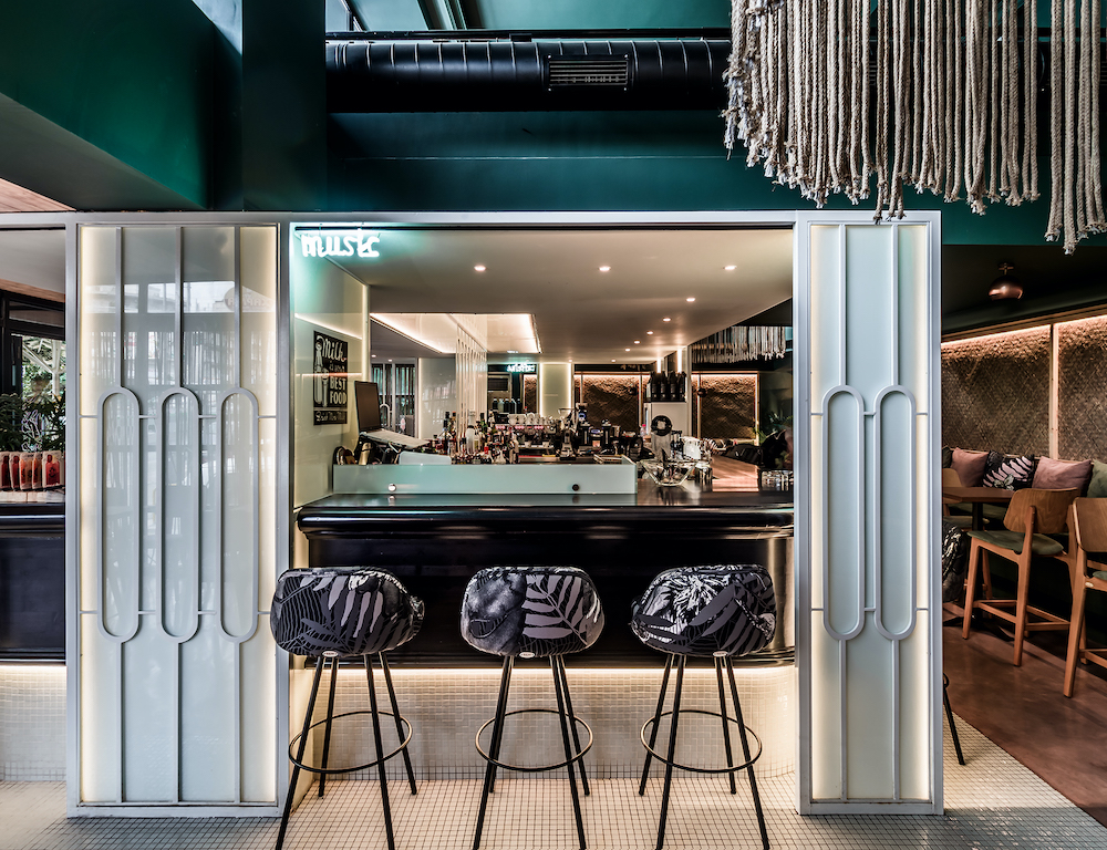 The central design element of this all-day location is a black-and-white bar inspired by the 50s – and by those Milk Bars that Greek emigrants got to know in Australia. Open from all sides, the central bar is surrounded by a sitting area that connects inside and outside. An overarching theme joins this: the creation of a surreal garden.