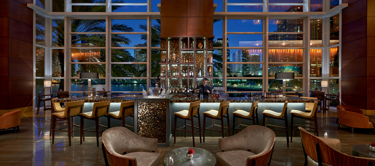 The MO Bar in the Mandarin Oriental Hotel convinces with its elegance and stunning sea views. The interior with wooden and leather materials give the bar a timeless and cozy atmosphere. The recycled glass bar counter was custom made by Arquitectonica.