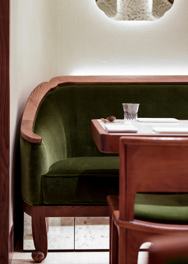 The cream-colored linen wallpaper wraps the room like a protective cocoon, reminiscent of the cloth traditionally used to shape blocks of tofu. An imposing travertine dining counter surrounds the open kitchen.