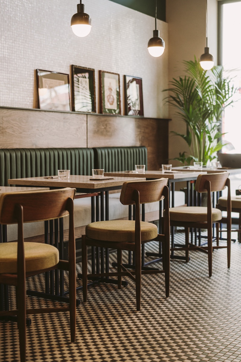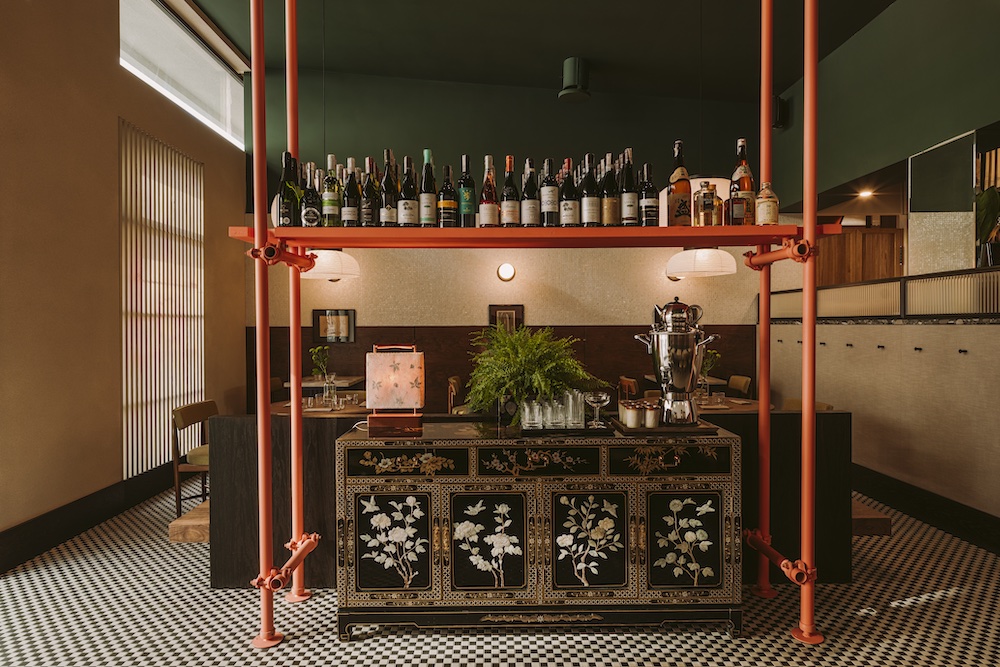 The floors with black and white tiles originally engage with mid-century chairs, mother-of-pearl mosaics, rice paper lamps and walnuts wood panelling.