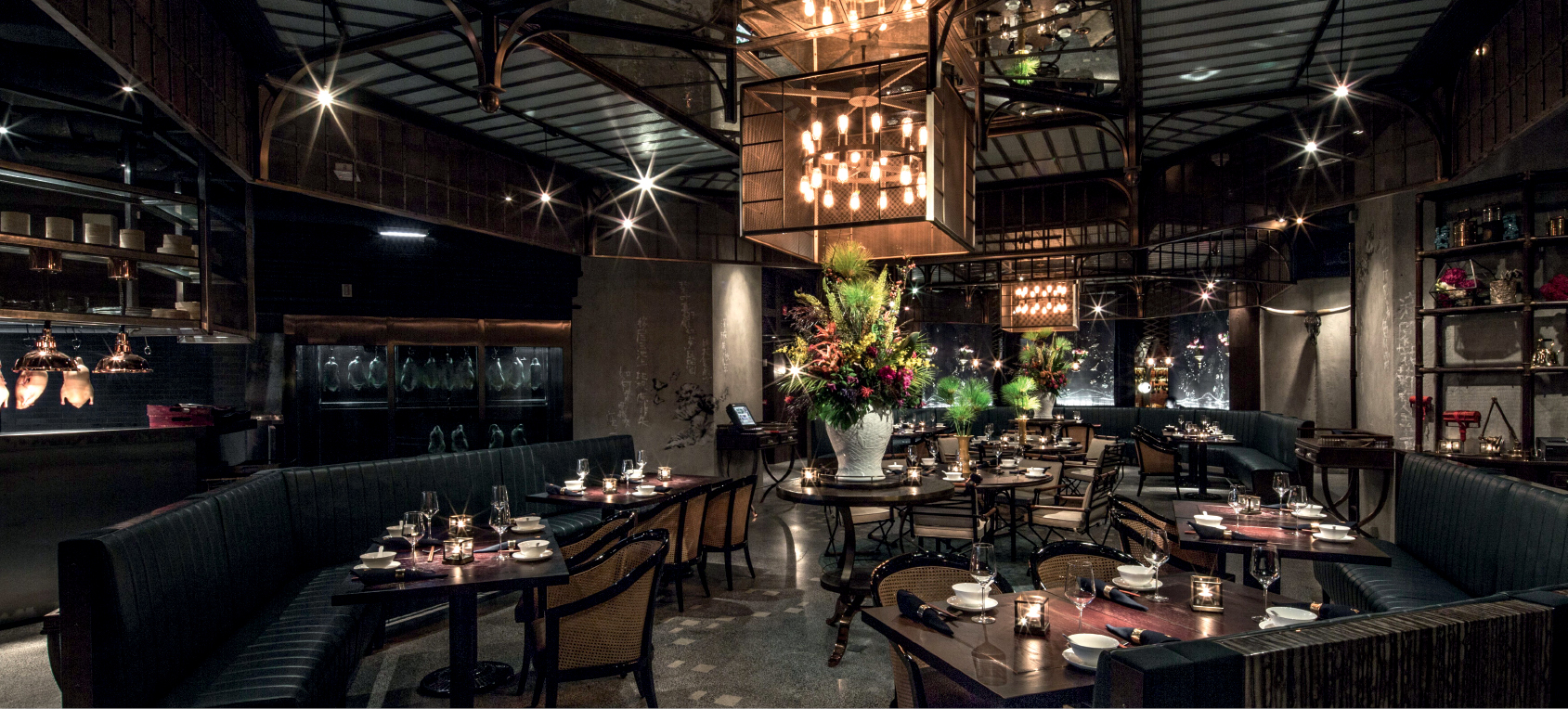 Mott Street is actually located in New York. The first Chinese food store was opened in number 32, a culinary pilot. The design uses metal, wood, rattan and leather and reminds of the story. Excentric lighting and original deco, such as art pieces and a large Chinese Abakus slide-ruler combine an industrial New York flair with Chinese handicraft.