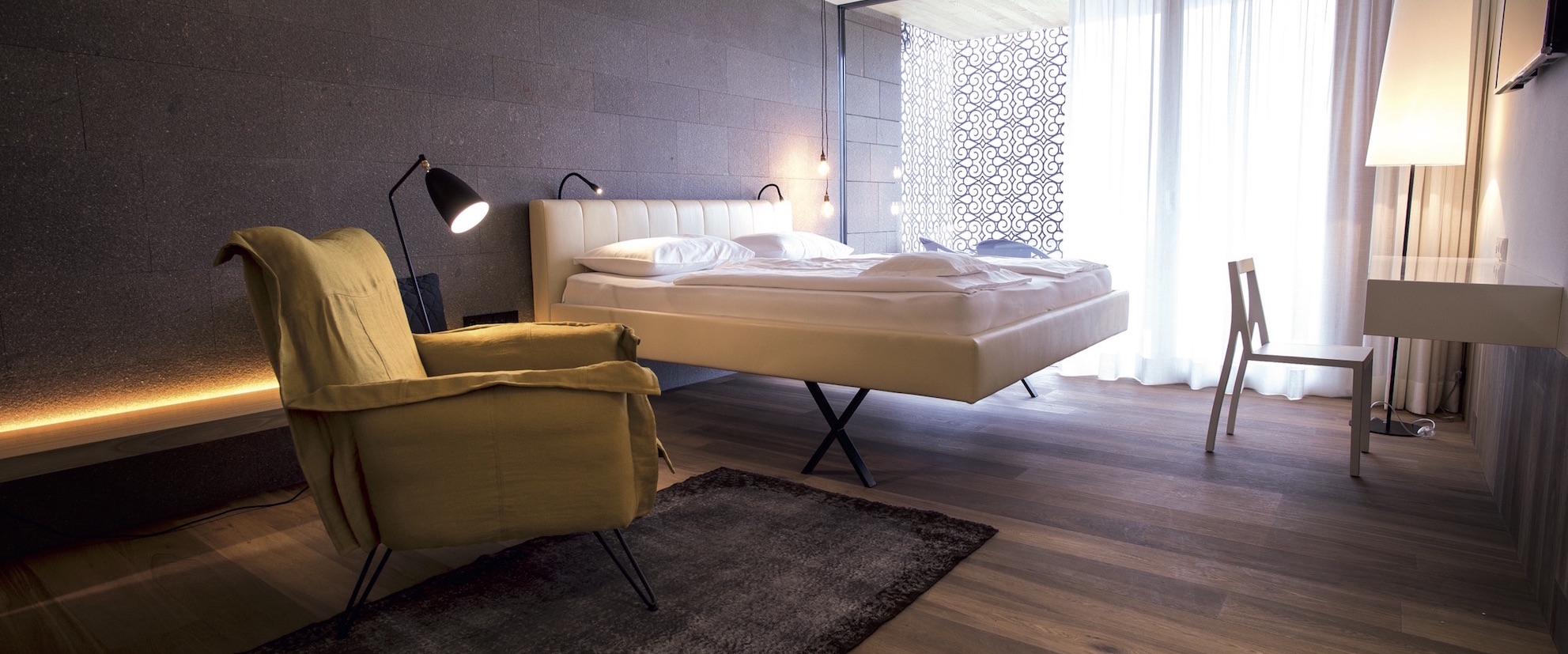 The new facade and parts of the interior were performed with the local Porphyr stone. United with a warm color palette a cozy atmosphere was created, very fitting for the cuddly atmosphere wellness approach of the hotel located 30 minutes from Bozen.
