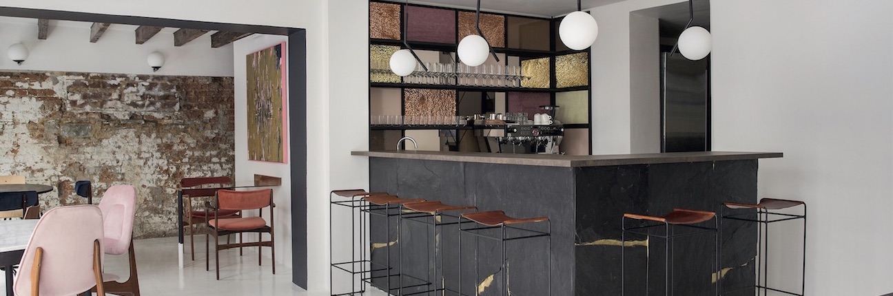 The shared cuisine trend was as much respected as the understatement of simple elegance. The ceramics collection of Studio Twocan inspired the choice of colors – such a subtle pink, charcoal for the bar, muted white walls and floors plus terracotte shades for the existing stone walls and the copper tables.