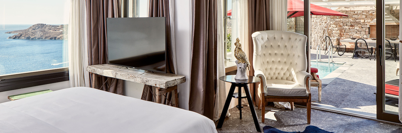 The Myconian Avalon was built into the naked rock and is an impressive proof of traditional Cycladian architecture that combines local stones with white walls and wooden windows. Concrete floors harmoniously melt with contemporary and classic furniture.